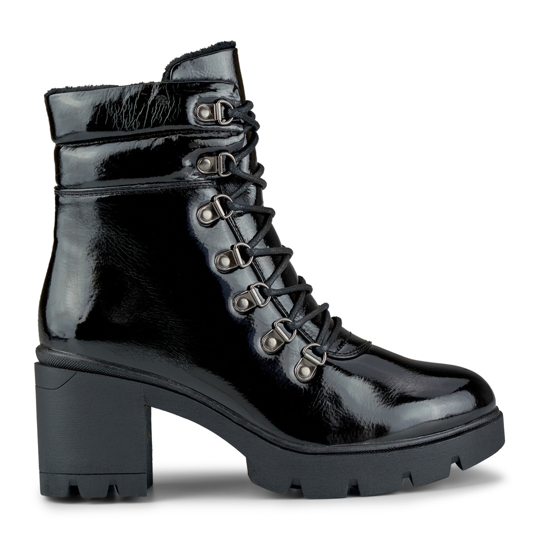 Den lackerade ytan lägger till stil och modern karaktär, och den praktiska blixtlåset och snörningen garanterar en perfekt passform för foten. Den 7 cm höga stolpen säkerställer stabilitet och komfort under dagen, och isolering från eko-futra kommer att hålla värmen på svalare dagar. Den syntetiska sulan är lätt och hållbar, idealisk för vardagsbruk.