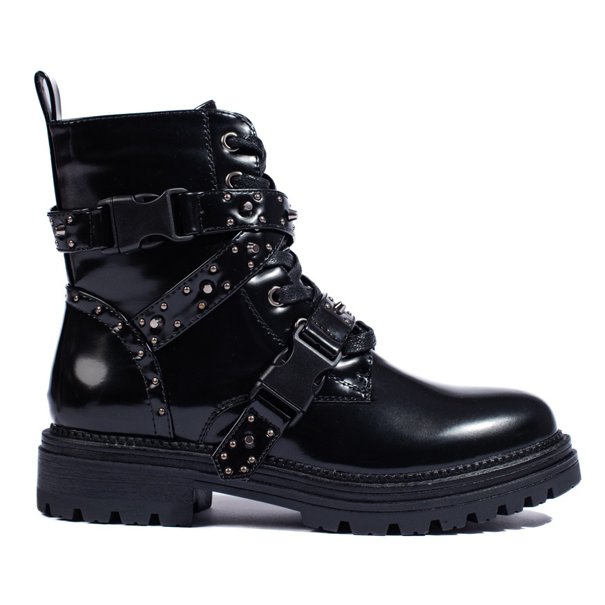 SHELOVET Damsvarta patentarbetarstövlar är det perfekta valet för kvinnor som värdesätter både stil och komfort. Dessa ankelboots är gjorda av högkvalitativt lackläder och har en elegant, glänsande finish och moderiktiga detaljer som strass och nitar.