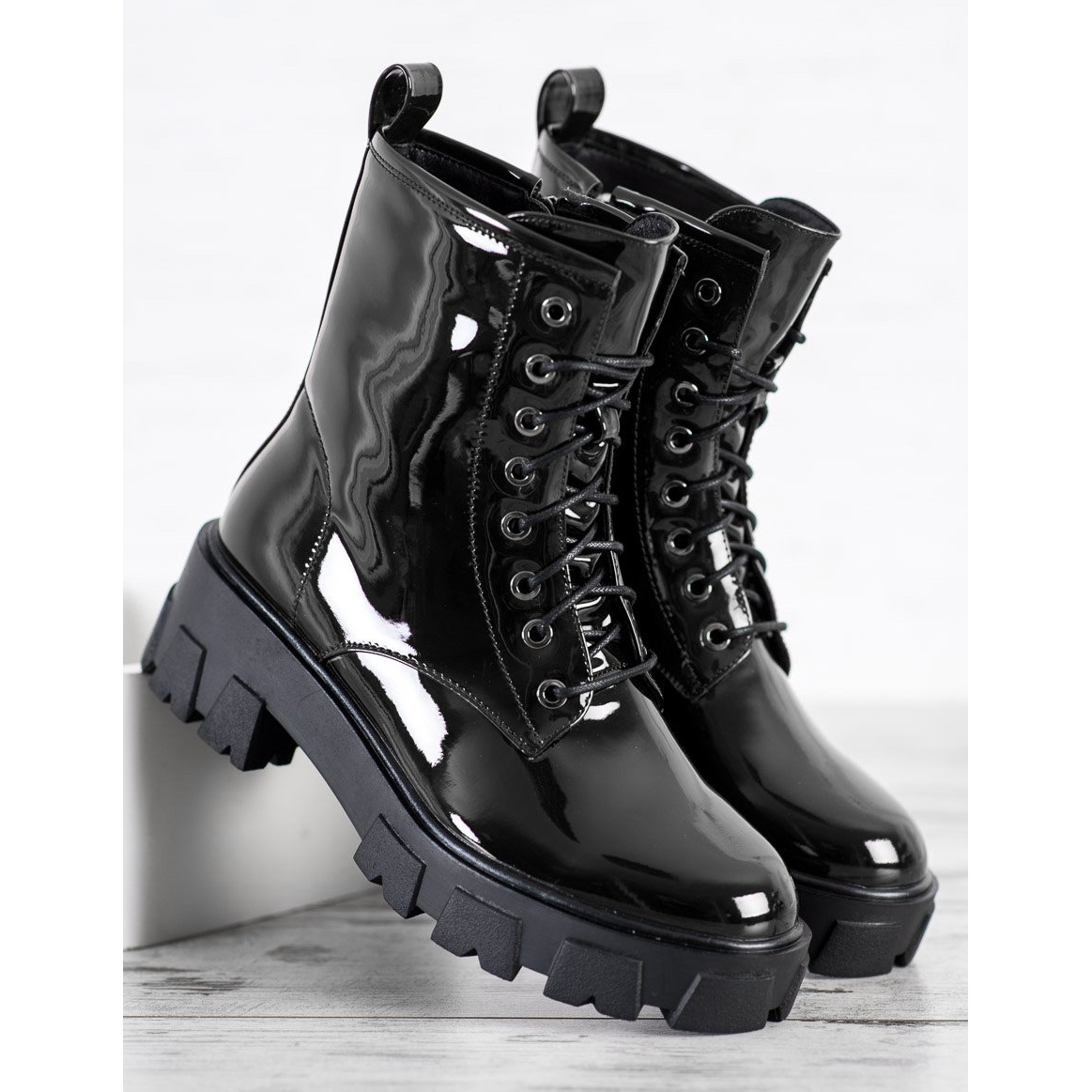 Upptäck den unika stilen från Fashionable-kollektionen från Goodin - lackade arbetarstövlar i en elegant svart färg. Dessa ankelstövlar för kvinnor kombinerar stil och komfort, perfekt matchar de senaste trenderna.