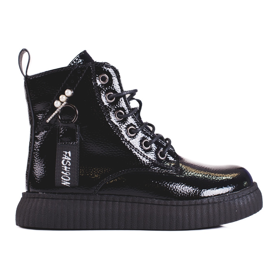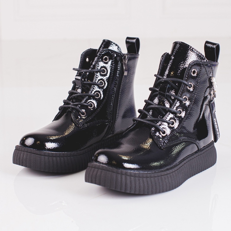 Upptäck elegans och komfort med flickstövlar i lackläder på Shelovet-plattformen i svart. Dessa snygga ankelboots, gjorda av ekologiskt läder av hög kvalitet, kombinerar klassisk design med en modern accent. Tack vare sin fulla tå och inbyggda, mjuka häl, garanterar de komfort att bära varje dag och under ceremoniella tillfällen.