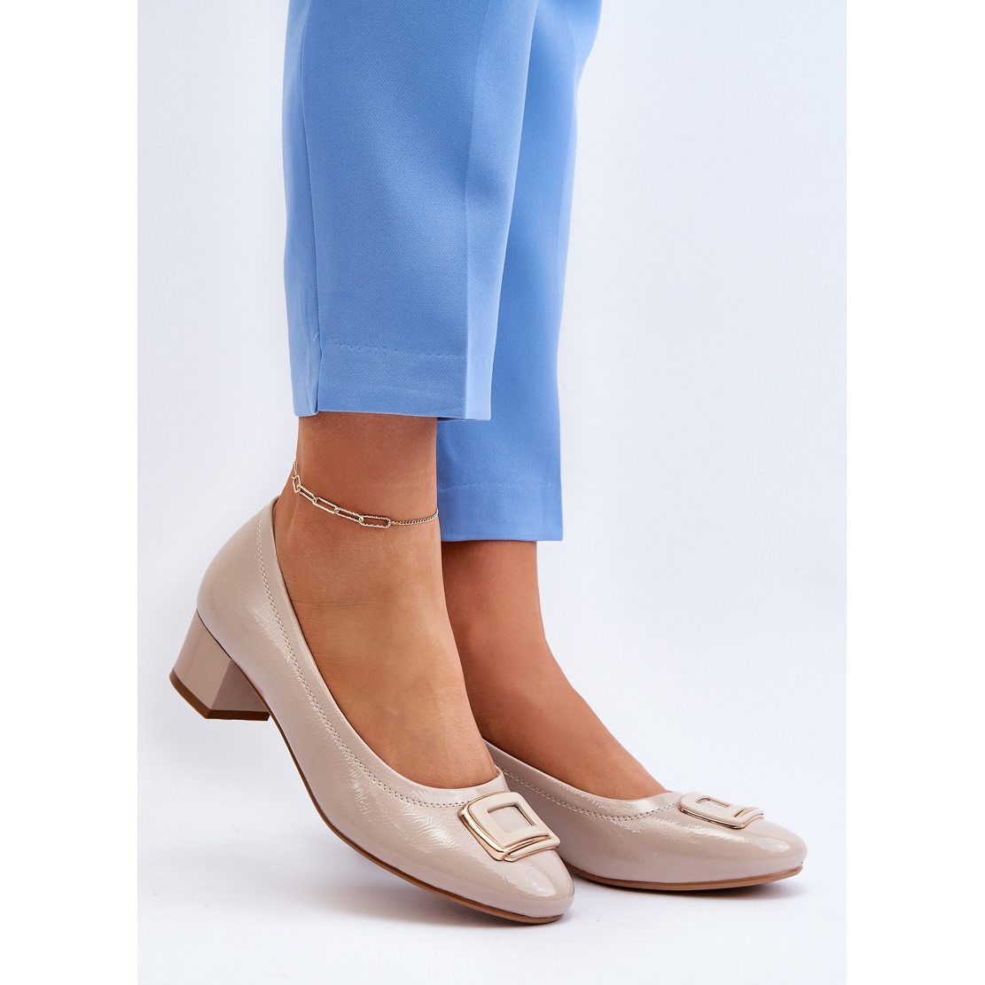 Detaljer: Vinceza Lackläderpumpar på block med dekoration, Beige Enollia