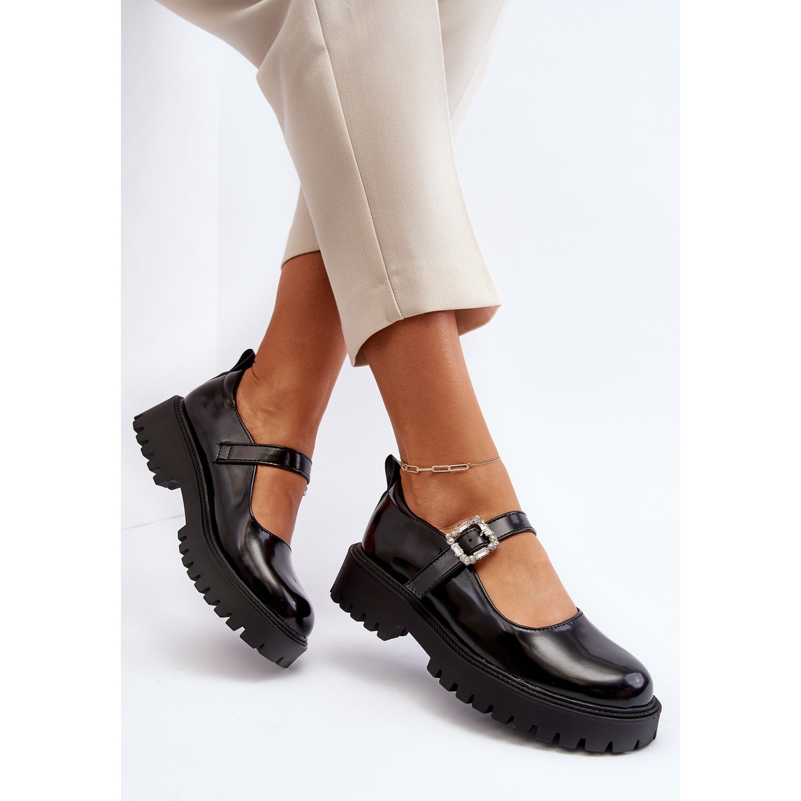Denna modell har designats med en låg, massiv 4 cm hög klack, vilket säkerställer stabilitet och komfort att bära hela dagen. Den runda tån och den mjuka innersulan av ekologiskt läder tar hand om dina fötter och ger dem tillräckligt stöd. Skorna utmärks också av en stilren, lackad yta och ett dekorativt spänne med zirkoner, vilket gör dem chica.