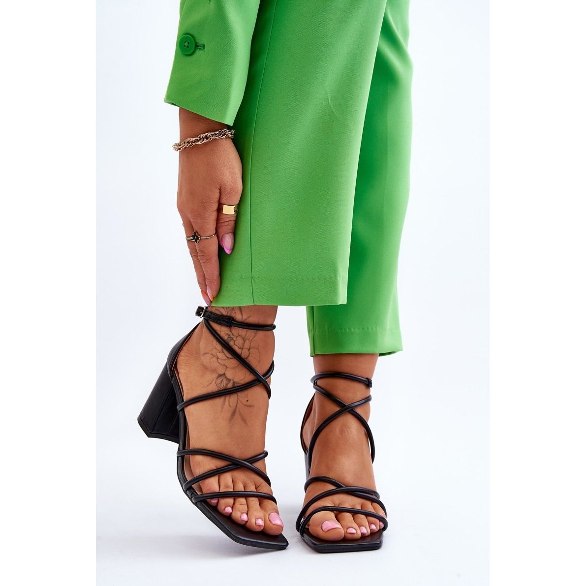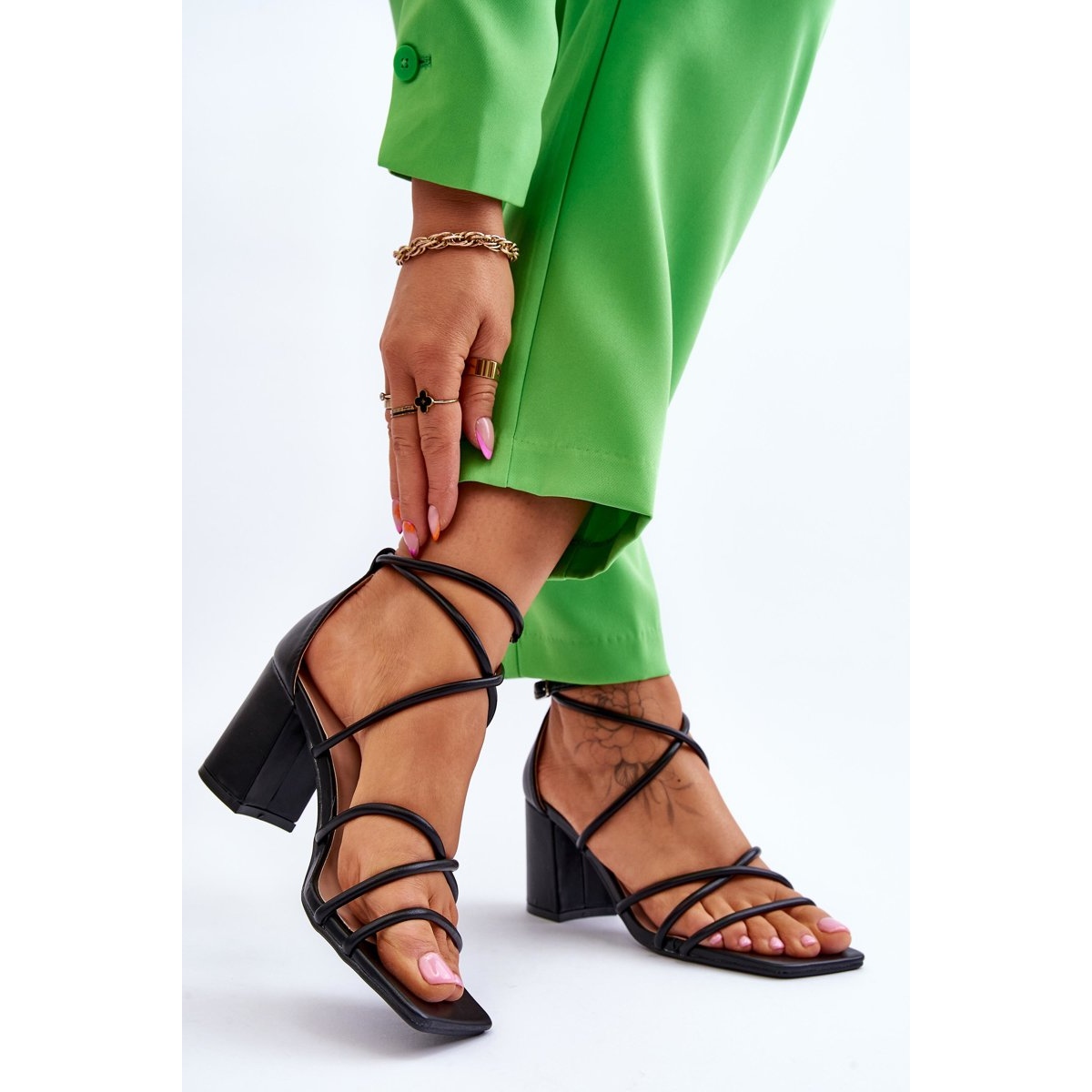 Sandalerna kännetecknas av en moderiktig, massiv klack i form av ett block, vilket säkerställer stabilitet och komfort när de bärs. Den öppna, fyrkantiga tån ger dem en modern karaktär, och den justerbara remmen med spänne ger en perfekt passform till foten.