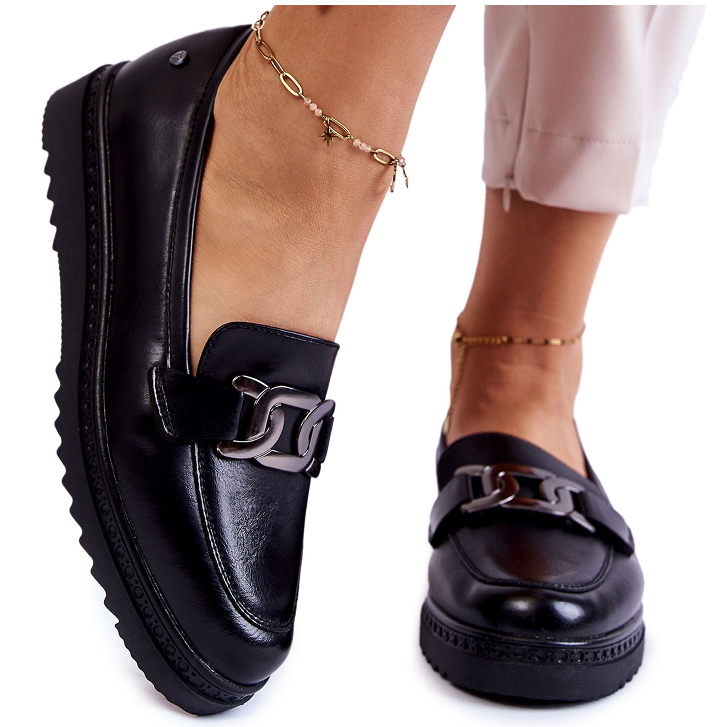 Vi presenterar Vinceza Abisso plattformsloafers i läder i en elegant svart färg, som är en perfekt kombination av komfort och stil. Tillverkade av högkvalitativt eko-läder, dessa klassiska skor utmärks av en unik detalj i form av en dekorativ kedja framtill, vilket ger dem en unik karaktär.