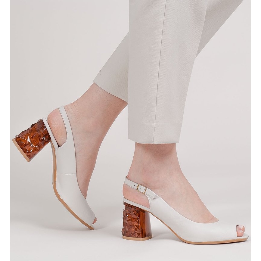 Sandalerna är gjorda av högkvalitativt, naturligt narvläder och ger inte bara ett estetiskt utseende, utan också hållbarhet och komfort att bära. Deras interiör är fodrad med läder, vilket ytterligare ökar användarkomforten. Högkvalitativt material som används för att producera sulan och hälen garanterar stabilitet och utmärkt stötdämpning, och den 7,5 cm höga blockhälen tillför elegans till varje steg.