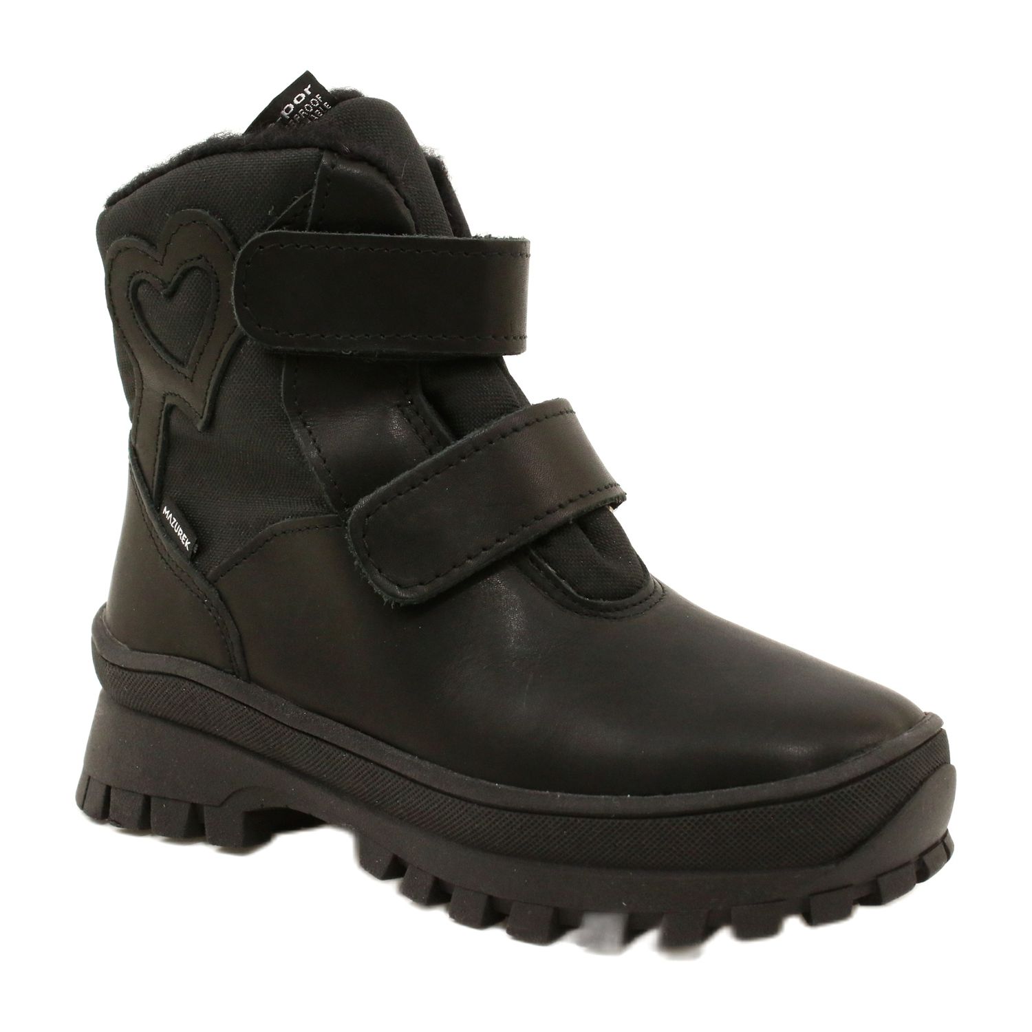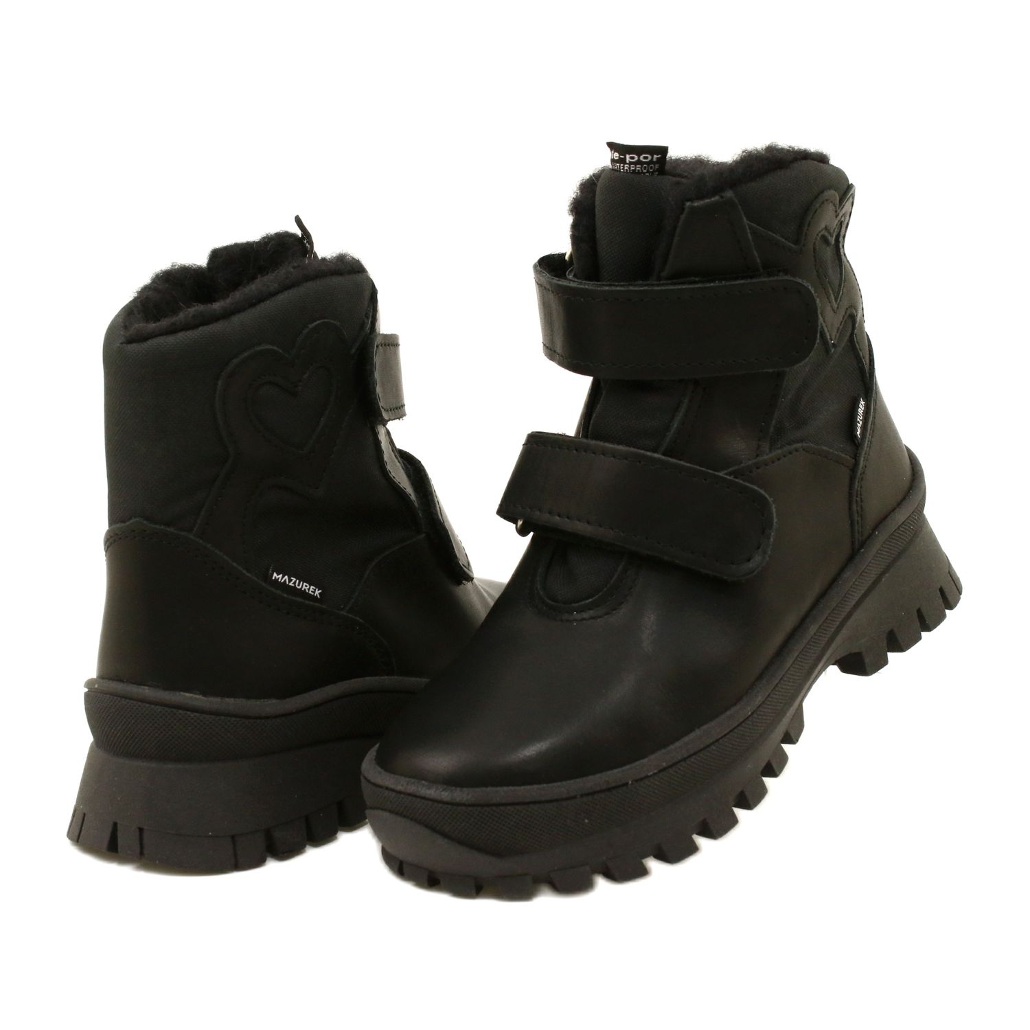 Eleganta och praktiska snöstövlar Mazurek 1351 Kombinera fast utförande av naturläder med ett vattentätt te-por-membran, tack vare vilka de skyddar fötterna från fukt när de spelar i snön och i regnet. Den klassiska svarta färgen med ett subtilt hjärta gör att skorna ser bra ut i både flickor och pojkar.