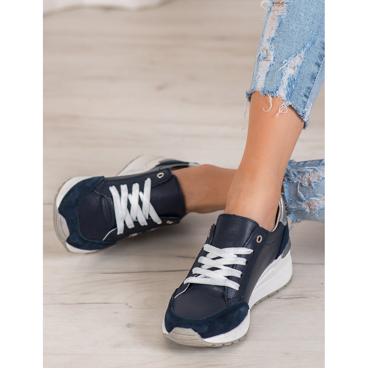 Tack vare ökningen av sulan kommer dina ben att se smalare ut både i kombination med byxor och i kombination med en kjol. Den universella marinblå färgen och subtila flerfärgade accenter gör dessa skor lätta att kombinera med en mängd olika stilar, från casual till mer elegant.