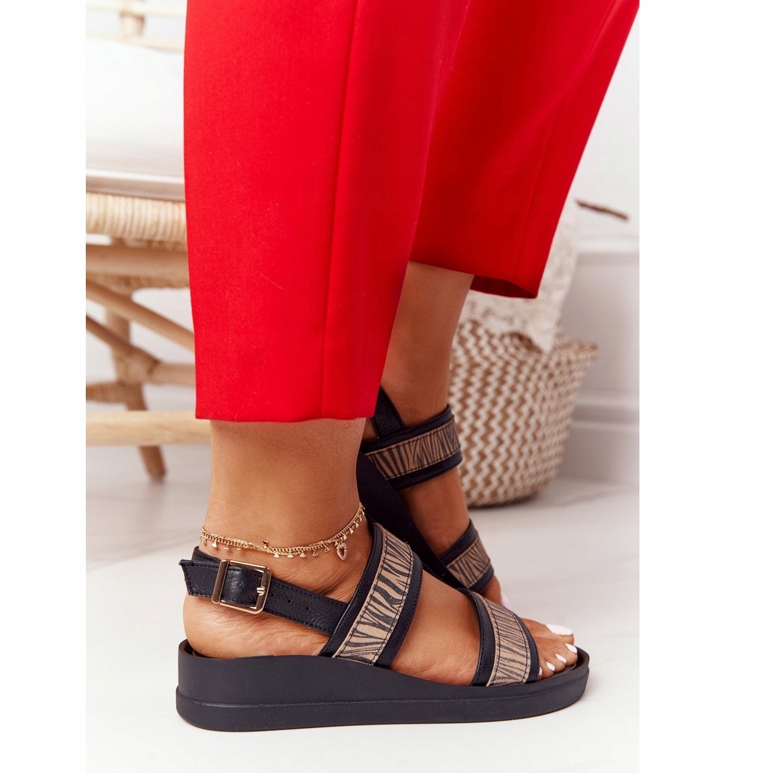 Ett klassiskt snitt med ett fashionabelt djurmotiv i en beige och svart ton kommer att fungera för både vardagliga och mer utformningar - det smälter bra med klänningar, kjolar och luftiga byxor. Spännfästningen låter dig exakt matcha sandalerna till foten, och den öppna tån lägger till en sommarkaraktär.