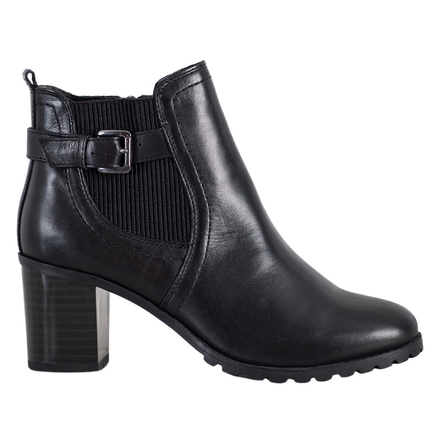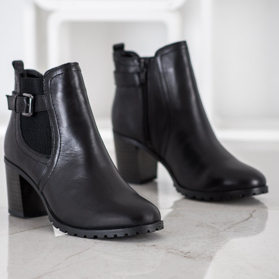 Ankelkängorna är gjorda av naturligt läder och ger inte bara utmärkt kvalitet utan också ett elegant utseende. Den runda tån och 7-centimeters hälen i form av ett block garanterar stabilitet och bärkomfort, och den styvade hälen ger självförtroende i dina steg. Varm invändig isolering gör stövlarna perfekta för kallare dagar, och textilmaterialet inuti ökar användarkomforten.