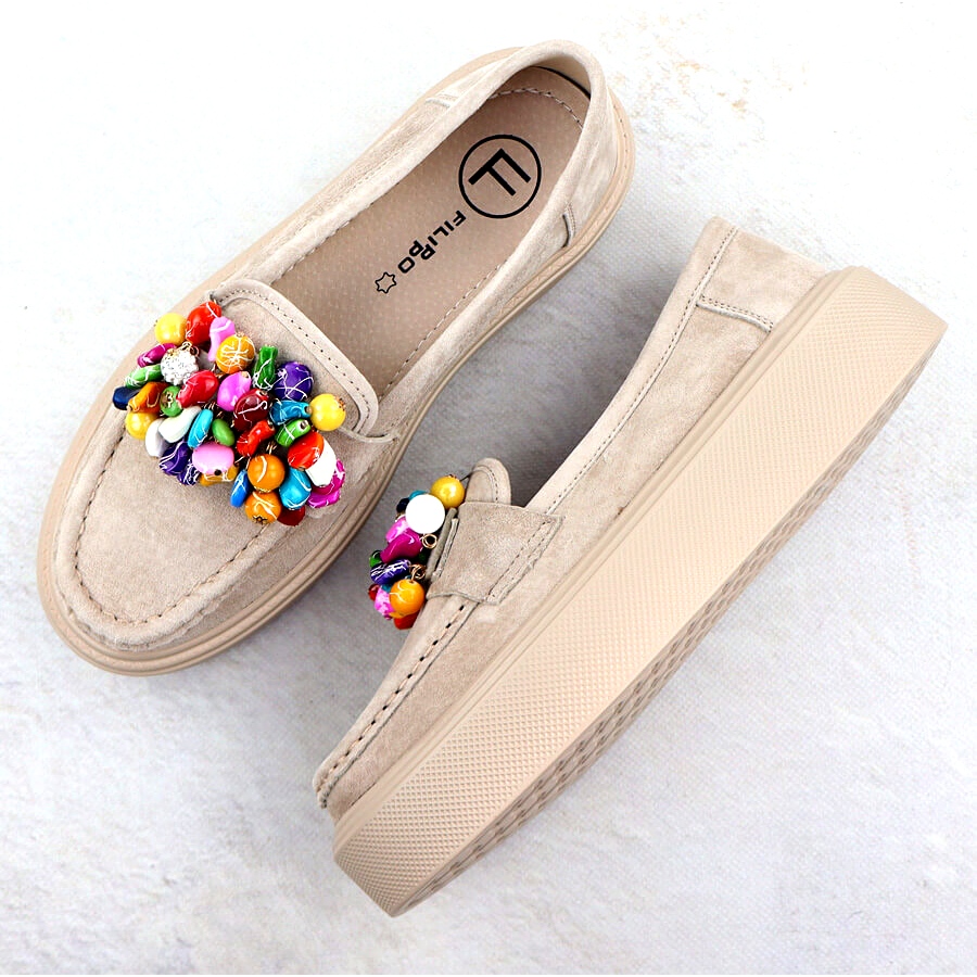 Läderloafers på en plattform med Beige Beige Filippo DP6765 är ett stort förslag för kvinnor som vill kombinera komfort med ett fashionabelt utseende. Dessa skor är gjorda av naturliga mocka läder av högsta kvalitet och ser inte bara eleganta ut utan är också hållbara och bekväma.
