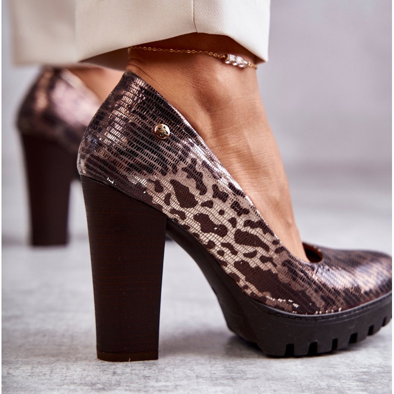 Eleganta maciejka -pumpar, tillverkade för hand i Polen från naturläder av högsta kvalitet. Det klassiska snittet med en mandel och en stabil 10,5 cm bar ger figuren av sofistikerad elegans, och säkerställer samtidigt komforten av användningen tack vare den mjuka, profilerade insatsen av naturläder. Ett känsligt djurmotiv i nyanser av brunt lägger till karaktär och mångsidighet - idealisk för både kontors- och kvällstyliseringar.