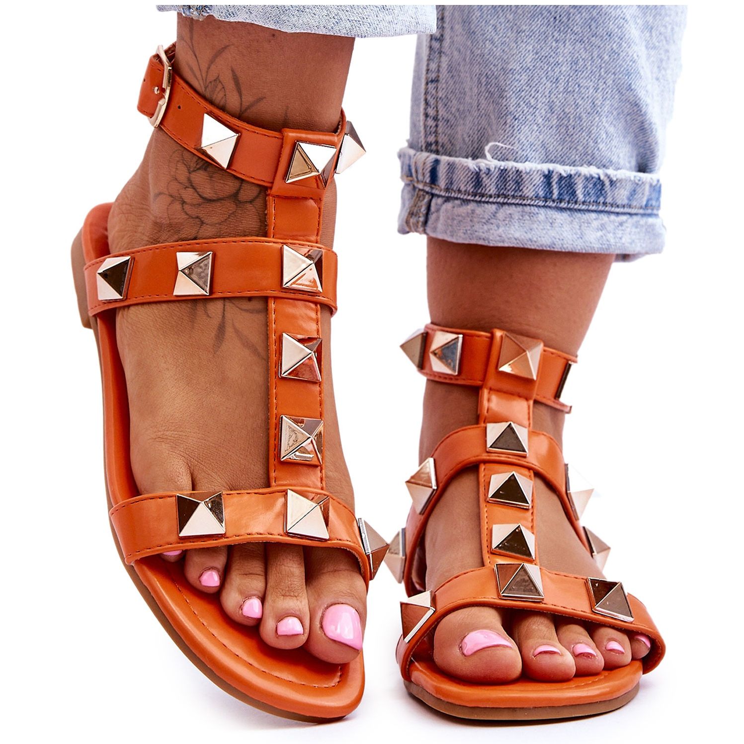 Dessa sandaler kännetecknas av stora, guldfärgade nitar som väcker uppmärksamhet och ger skorna en lite rockig karaktär. Kombinationen av uttrycksfull orange färg och guldaccenter gör dessa sandaler till det perfekta valet för kvinnor som gillar att sticka ut från mängden och experimentera med mode.