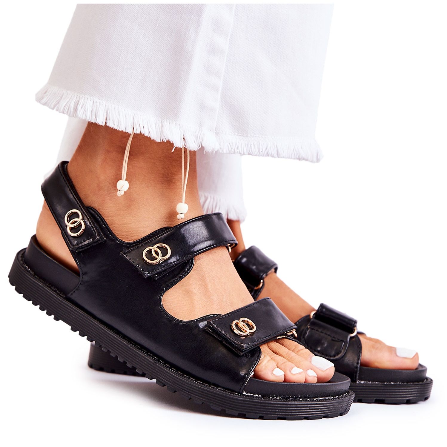 Modellen är utrustad med tre remmar fästa med kardborre, vilket möjliggör enkel och snabb justering. En ytterligare fördel är subtila dekorationer på de främre remmarna, som ger sandalerna en unik karaktär. Innersulan av eko-läder är profilerad, vilket garanterar komfort vid långvarigt slitage. Sandaler med platt sula, 2 cm hög, ger stabilitet vilket gör dem perfekta för vardagliga promenader eller resor utanför stan.