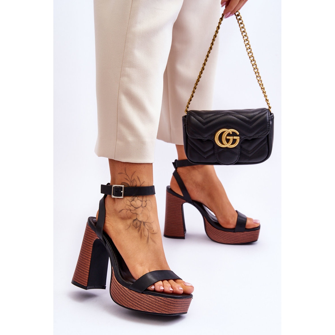 Information: Lädersandaler på en tjock svart marinaplattform