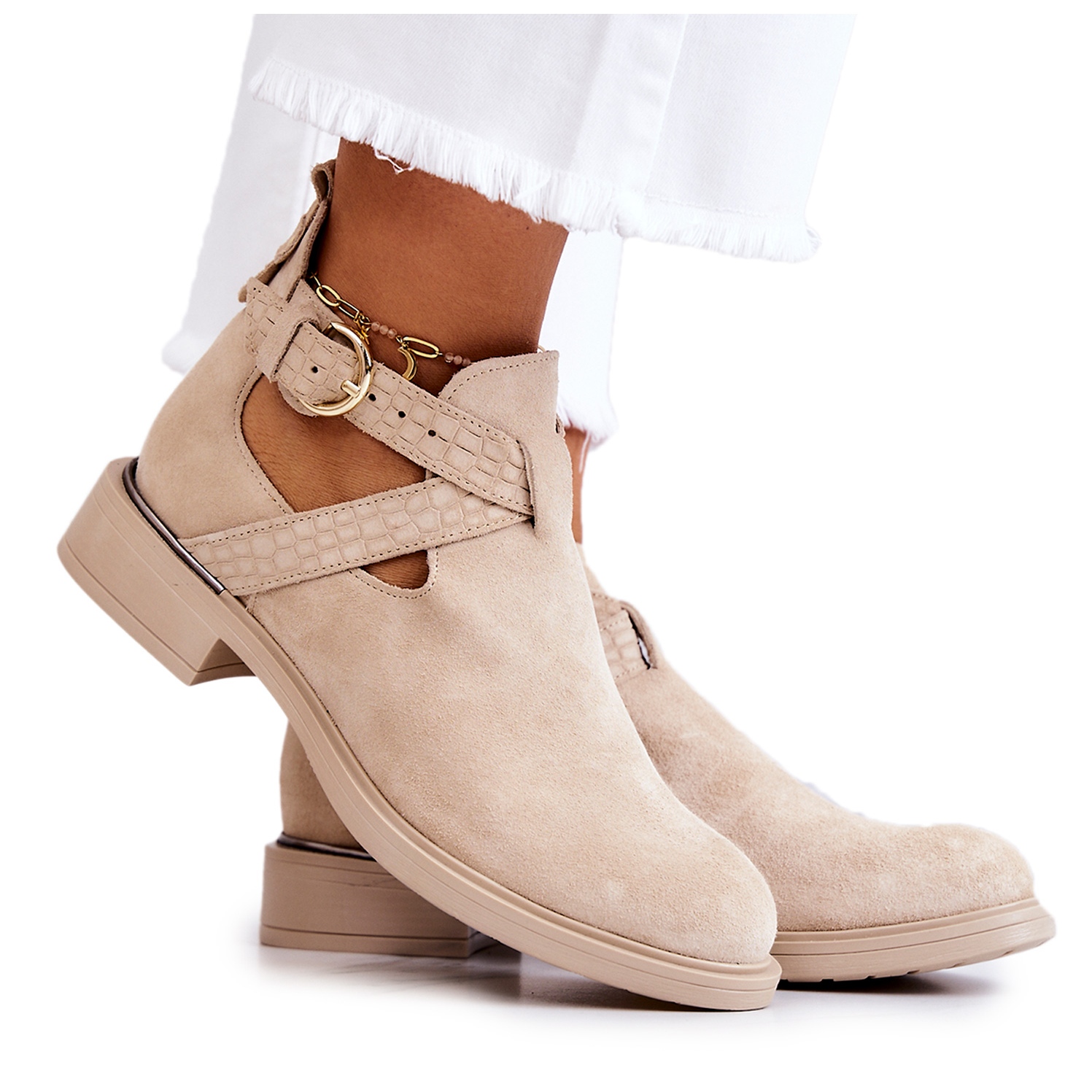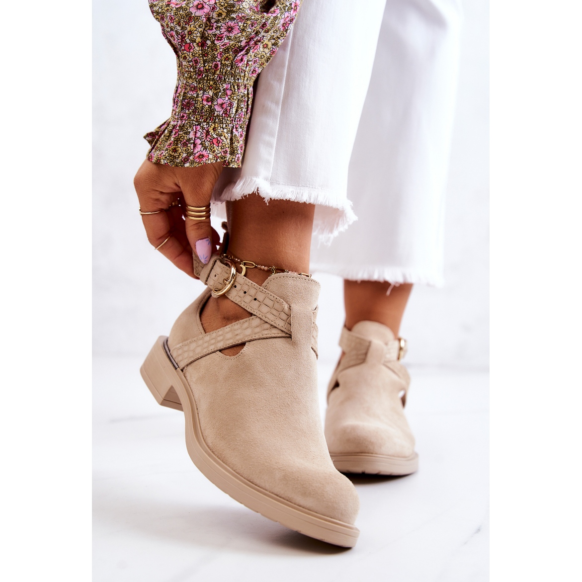 Stövlarna kännetecknas av sin fashionabla skärning, och de fenomenala utskärningarna på sidorna av ovandelen gör dem lätta och moderna. Den justerbara remmen som fästs med ett spänne ger en perfekt passform till foten, vilket ökar användarkomforten. En platt 3,5 cm hög klack säkerställer stabilitet, vilket gör dessa stövlar till ett idealiskt val för varje dag och olika tillfällen.