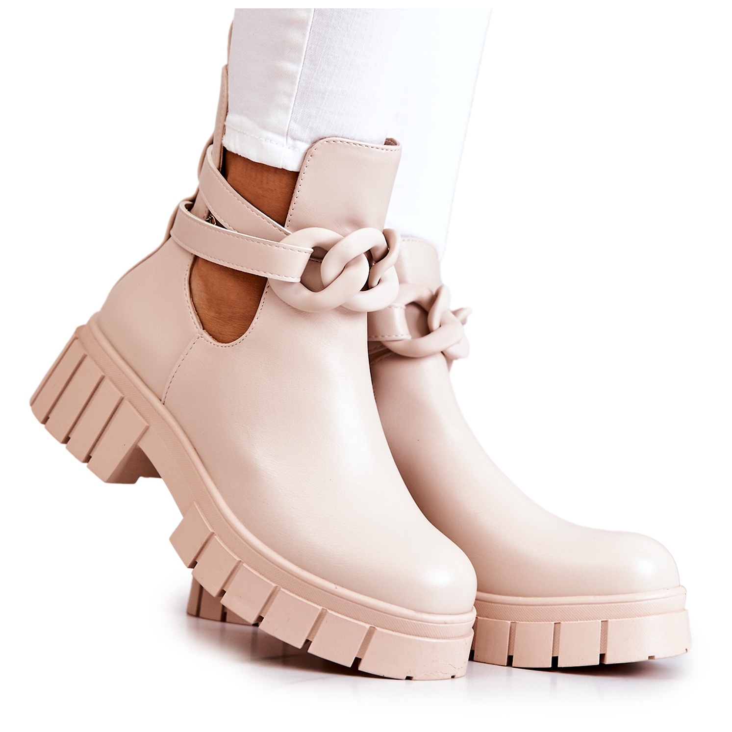 Modellen kännetecknas av en slip-on design, vilket gör det snabbt och bekvämt att ta på dem. Tack vare den platta hälen och den massiva sulan (3 cm hög) kan du njuta av stabilitet och isolering från den kalla marken. En ytterligare fördel är ett bälte med en dekorativ kedja som enkelt kan tas bort, vilket anpassar stövlarna till din individuella stil.