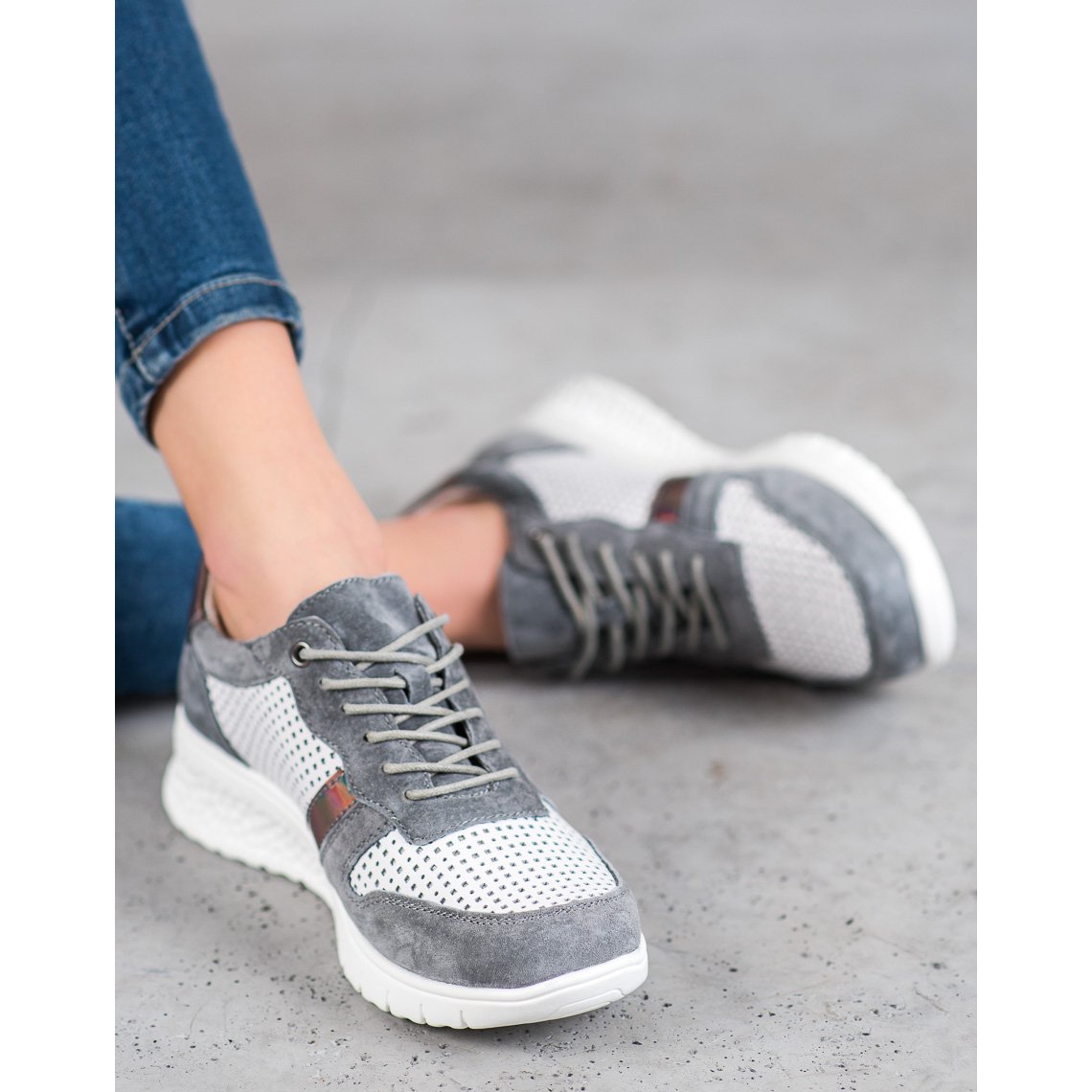 Upptäck unik stil och komfort med Filippo-skor i en trendig vit och grå variant! Dessa extremt fashionabla damskor kombinerar modern design och funktionalitet. Holografiska insatser ger dem en unik karaktär som väcker uppmärksamhet, och det genombrutna mönstret ger en lätt och luftig look.