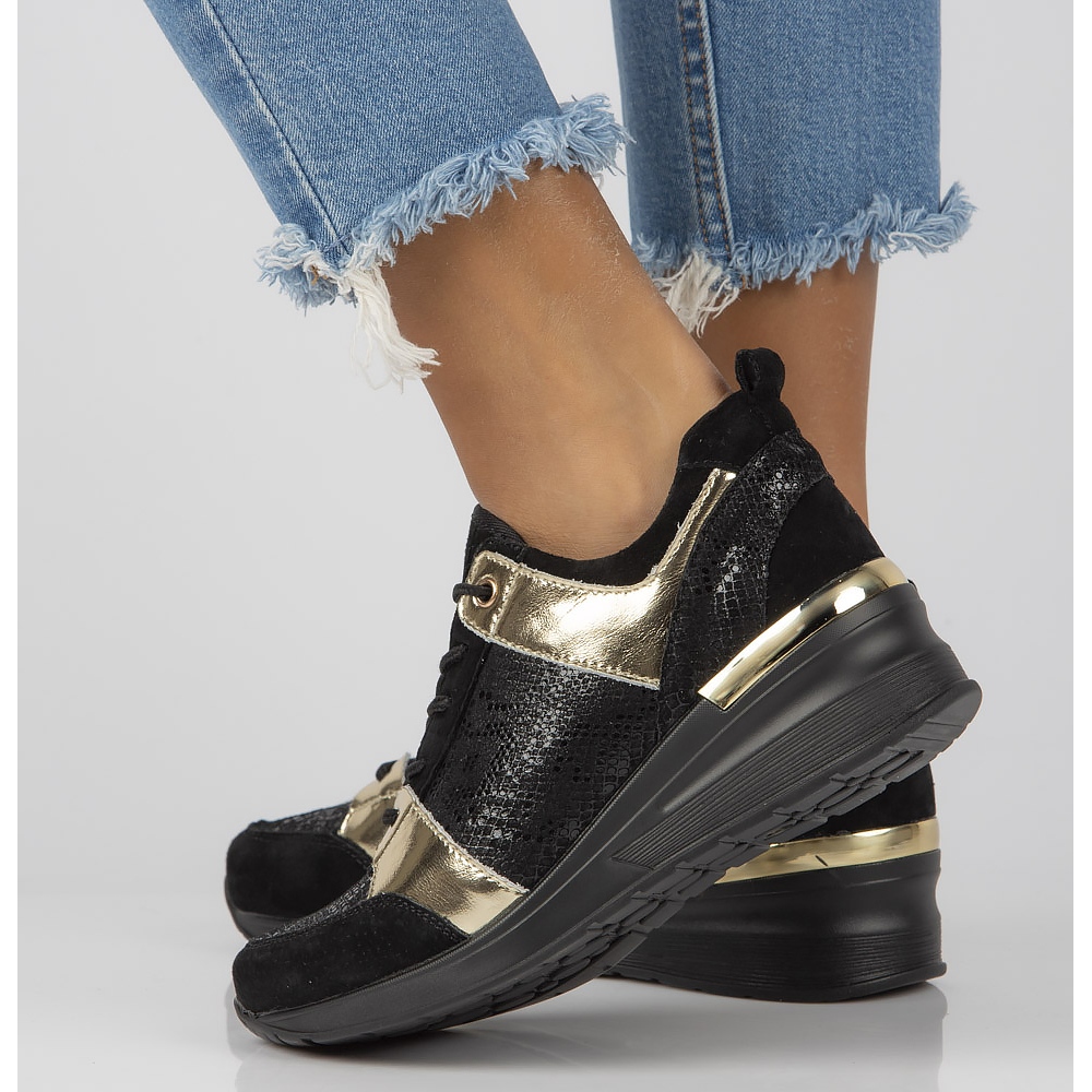 Sneakersen har snörning, vilket möjliggör enkel justering av omkretsen och stabilisering av foten. Den runda tån ger subtilitet, och den 4,5 cm höga kilen med en 1,5 cm plattform gör att du kan njuta av lätthet och större höjd utan att kompromissa med komforten.