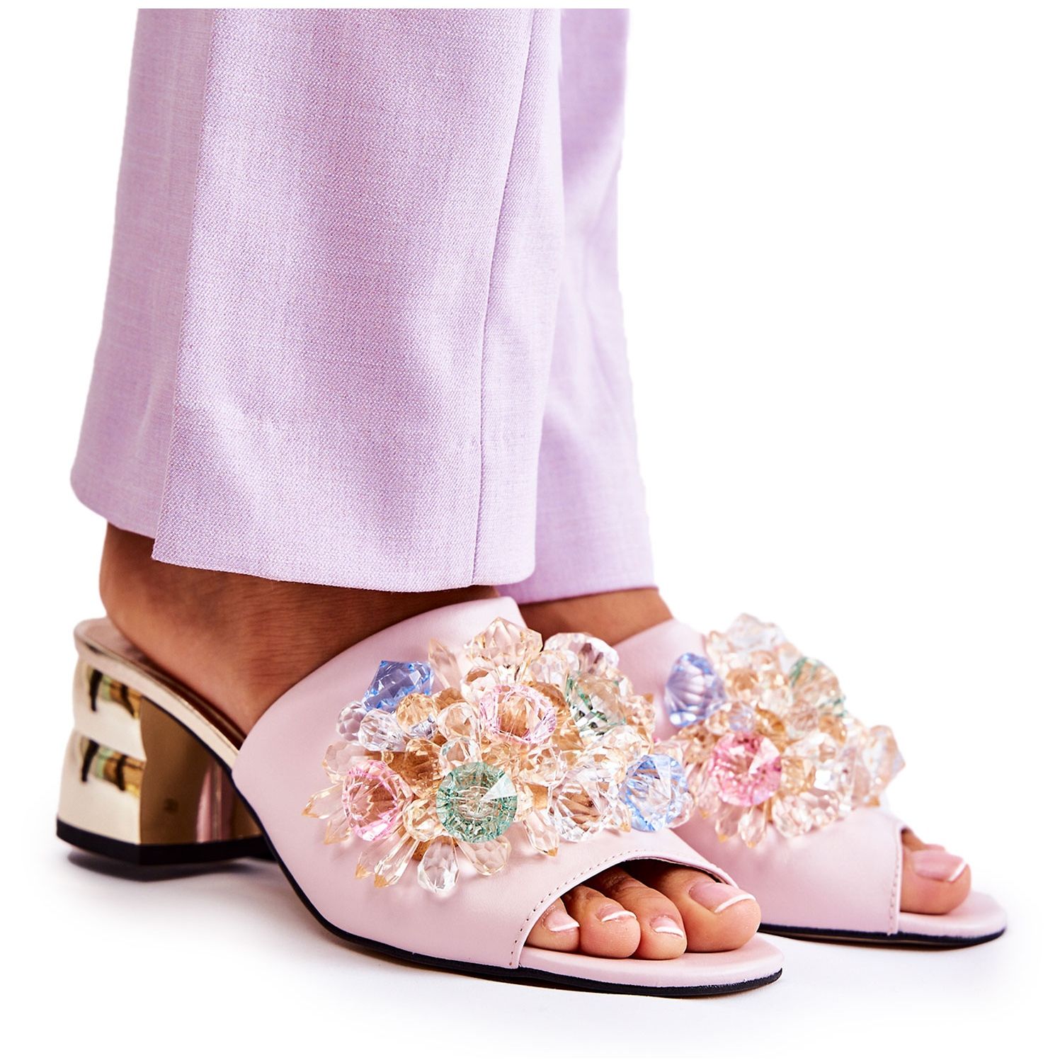 Detaljer: PA2 Lädertofflor för kvinnor på höga klackar med rosa Calinda-dekoration