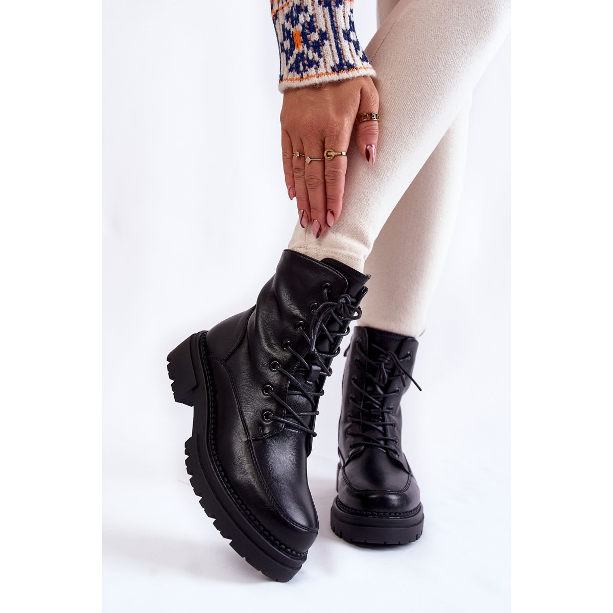 Stövlarna är isolerade med en mjuk skofilt, vilket gör dem till ett perfekt val för kallare dagar. Tack vare dragkedjan och ovandelen med snörning är de lätta att ta på och passar perfekt till foten. En platt 4,5 cm hög klack och en plattform med räfflor säkerställer komfort när du bär, och den förstyvade hälen framhäver stabilitet.