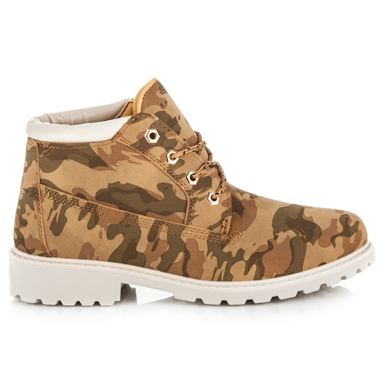 En plastsula med ett skydd och en 3 cm hög platt klack garanterar stabilitet under varje steg. En rund tå och en mjuk, inbyggd häl gör dessa stövlar inte bara praktiska utan också effektiva. Kamouflagemönstret ger karaktär och matchar perfekt den avslappnade stilen.