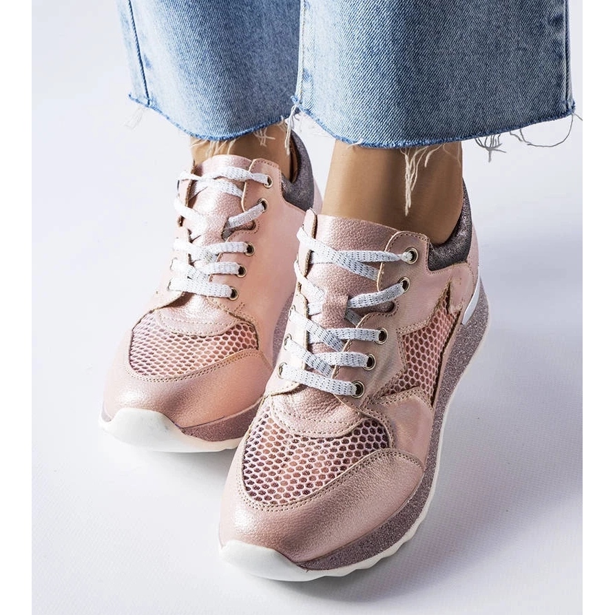Sneakers kännetecknas av en fashionabla, hög sula, som inte bara lägger till några centimeter, utan också betonar den dynamiska naturen hos hela skor. Deras yttre beläggning är gjord av naturläder, vilket säkerställer hållbarhet och elegant utseende, medan designerinsatser från eko-åkström i en vacker rosa färg ger dem en unik charm.