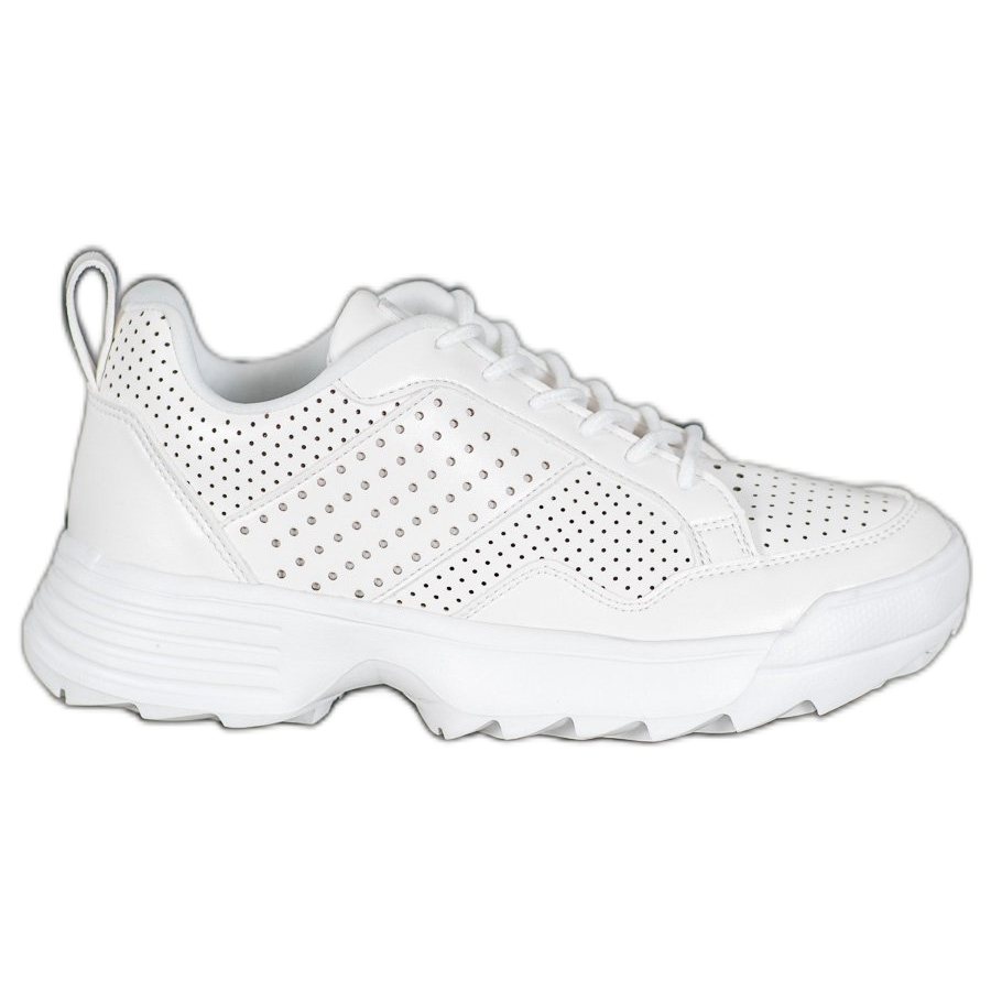 Vi presenterar Kylie damsneakers som kombinerar komfort och modern stil. De är helt gjorda i elegant vitt och är det perfekta valet för dagligt bruk och matchar många olika stilar. Deras genombrutna överdel av material som imiterar läder ger skorna en attraktiv karaktär samtidigt som de bryter den klassiska looken.
