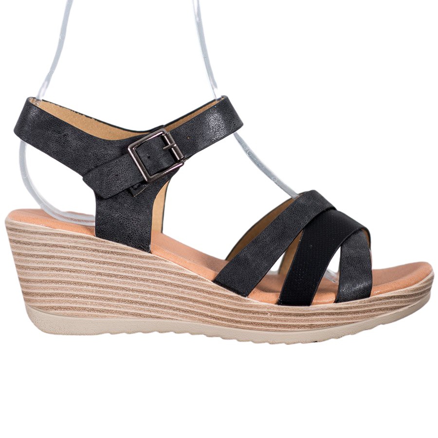 Skorna är monterade på 6,5 cm kilar, vilket garanterar inte bara ett attraktivt utseende, utan också komfort under användning. Dessutom säkerställer en 2-centimeters plattform framtill stabilitet och komfort vid varje steg. Spännet gör det lätt att justera, och den djärvt öppna hälen ger lätthet och fräschör.