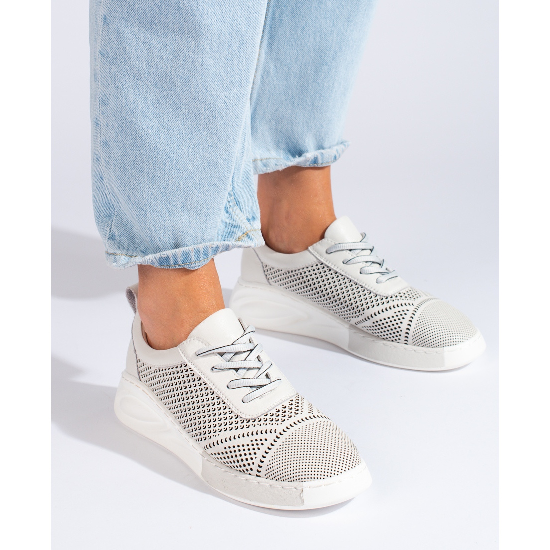 Denna modell passar in i den avslappnade stilen, vilket gör den till ett idealiskt val för alla årstider - från vår till vinter. Tack vare det genombrutna mönstret ger skorna ett lätt och fräscht utseende och tillåter samtidigt fritt luftflöde, vilket är användbart under varmare dagar. Dessa sneakers är även utrustade med ett läderinlägg som ökar bärkomforten.