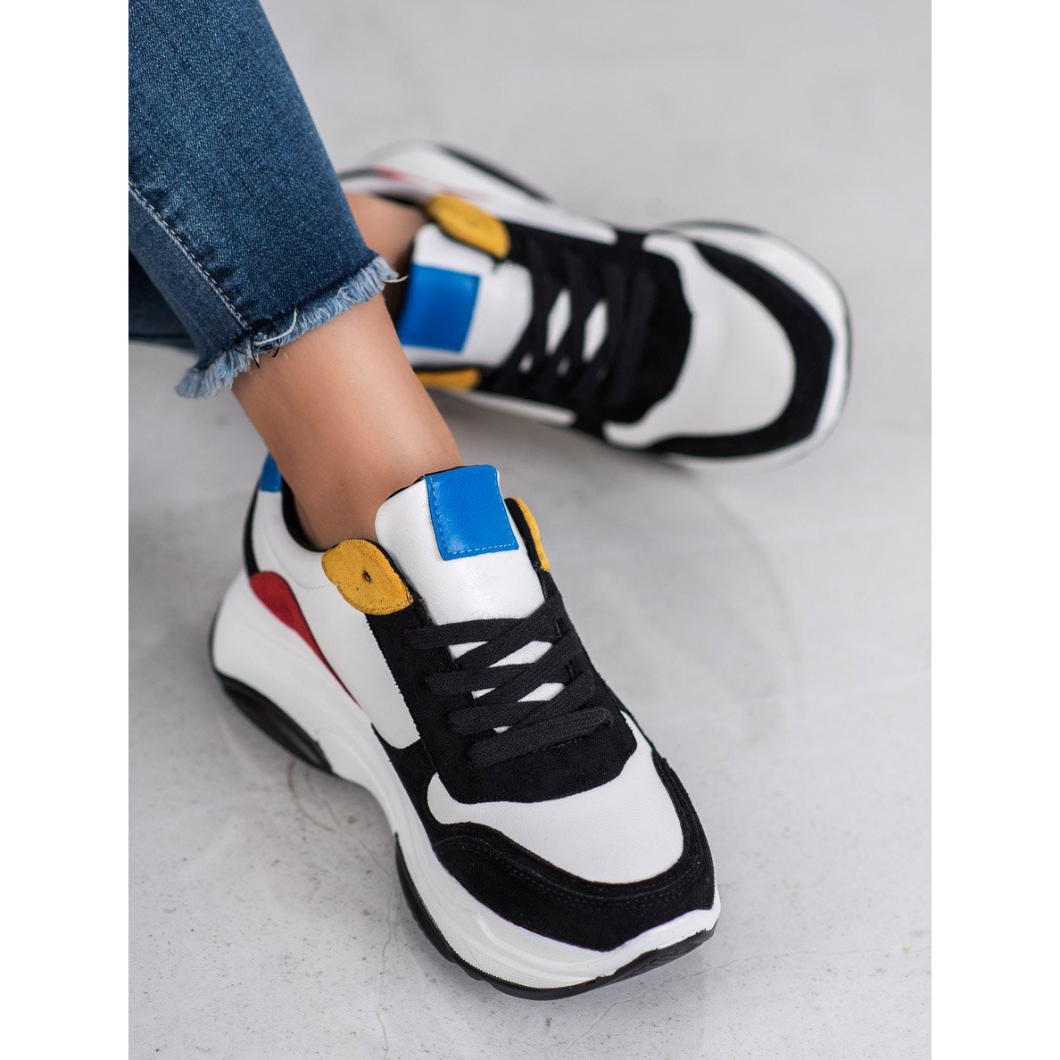 Vi presenterar Lightweight Multicolored Sneakers från SDS, som är en perfekt kombination av stil och komfort. Dessa unika damsneakers med en tjock sula njuter av sin moderna look och är ett idealiskt val för kvinnor som vill framhäva sin individuella stil i vardagliga outfits.