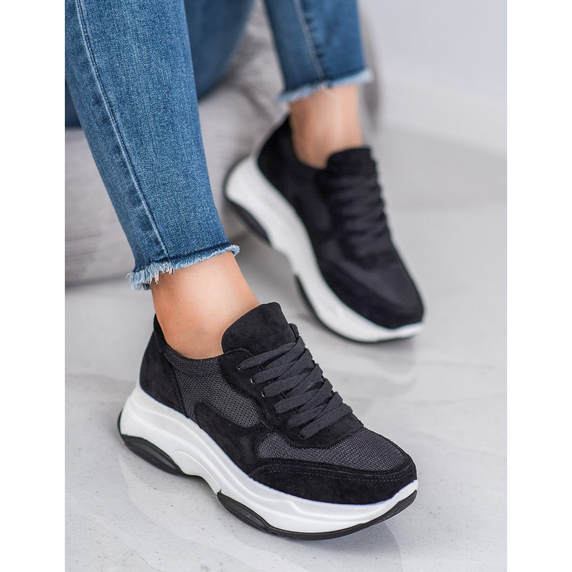 Vi presenterar lätta svarta Ideal Shoes sneakers - det perfekta valet för moderna kvinnor som värdesätter komfort och moderiktigt utseende. Dessa damskor med snörning är gjorda av högkvalitativt tyg i en elegant svart färg, vilket ger dem en universell karaktär.