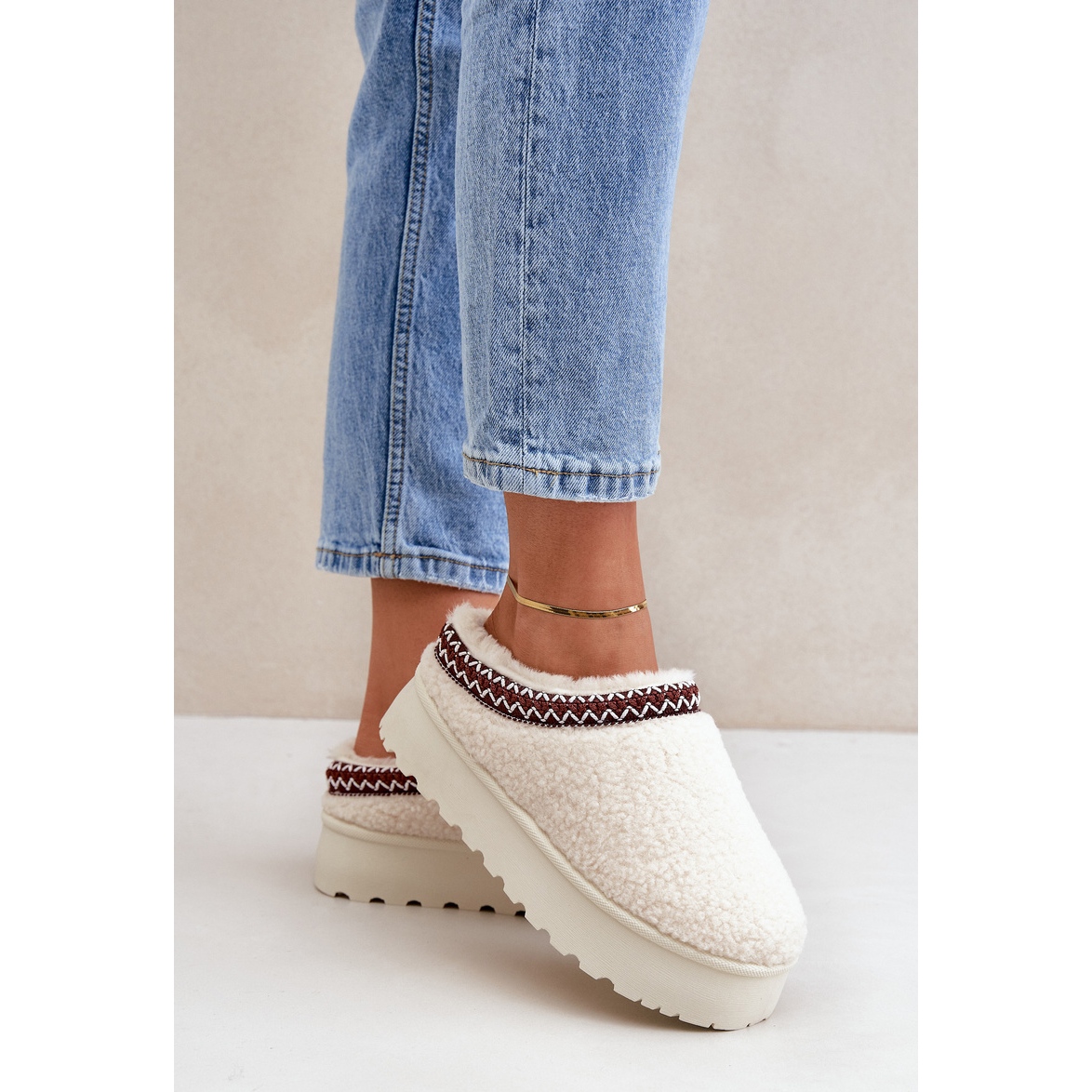 Detaljer: Ljusbeige tofflor av fårskinn på en plattform med päls