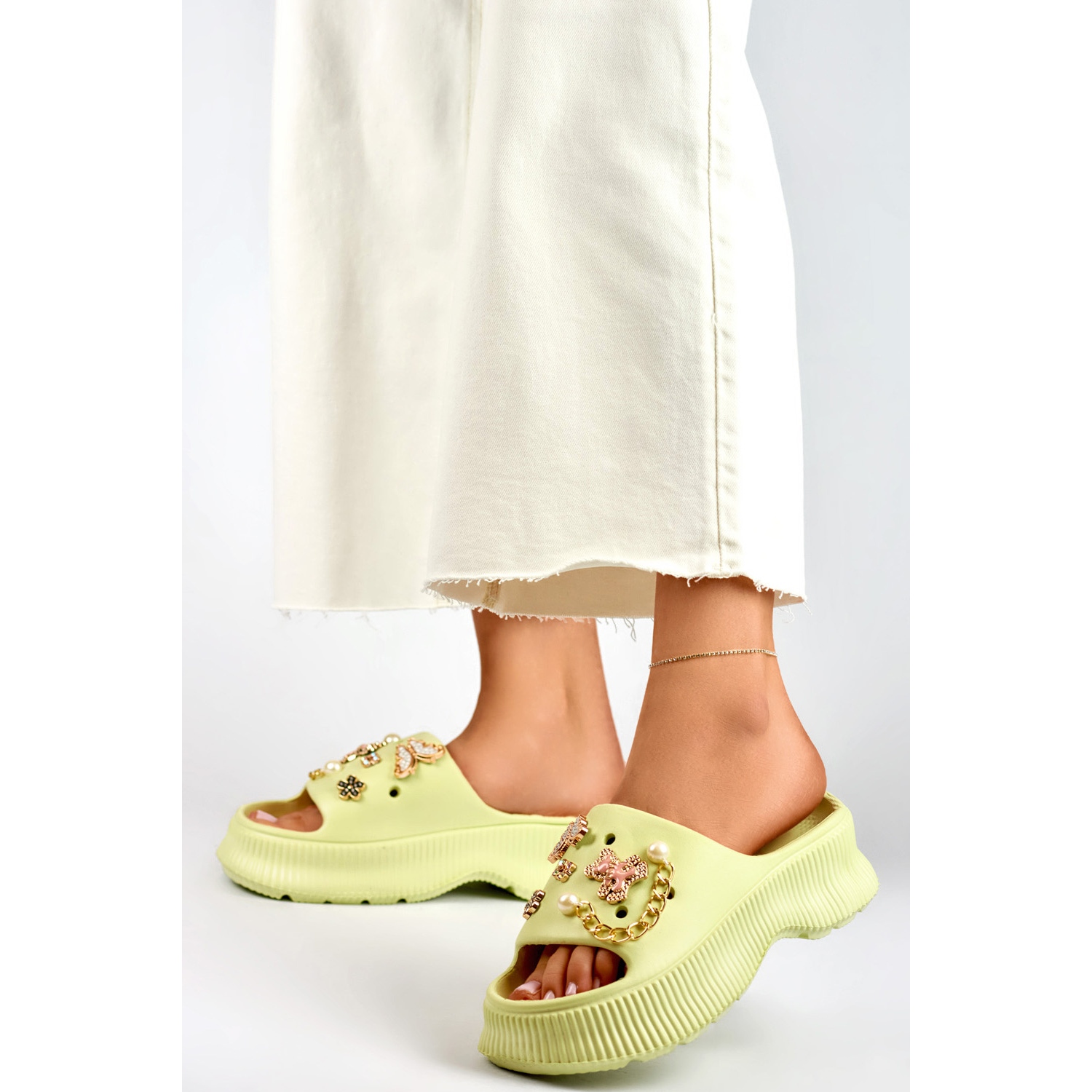 Missa inte möjligheten att lägga till denna fashionabla accent i din sommargarderob. Välj kvinnors ljusgröna gummiklaffar med dekorationer och njut av inte bara komfort, utan också elegans varje dag!