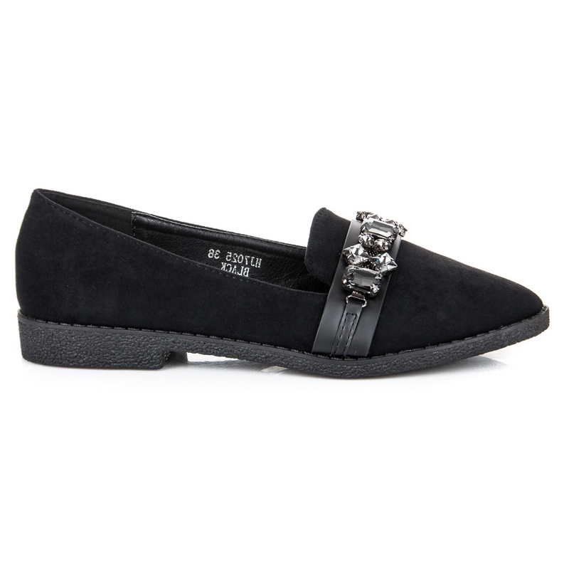 Upptäck elegans och komfort i en av de senaste modellerna från tillverkaren Sweet Shoes - svart mockasin i mocka dekorerade med kristaller. Dessa snygga skor är ett perfekt val för kvinnor som vill kombinera moderiktig design med komfort att bära.