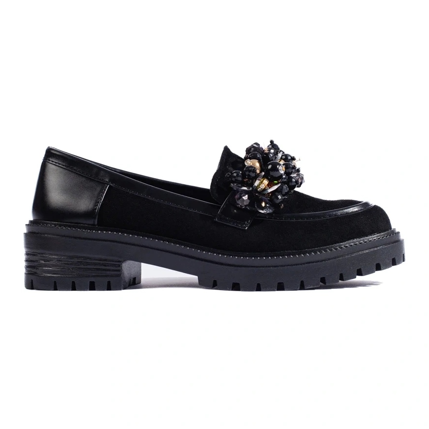 Elegant och bekväm - svarta Shelovet -loafers är ett förslag för kvinnor som värderar kombinationen av stadsstil med komforten att bära. Tillverkat av ekologiskt läder i en mocka finish, med en delikat accent i form av zirkonium, fungerar för både vardagliga och mer eleganta stiliseringar.