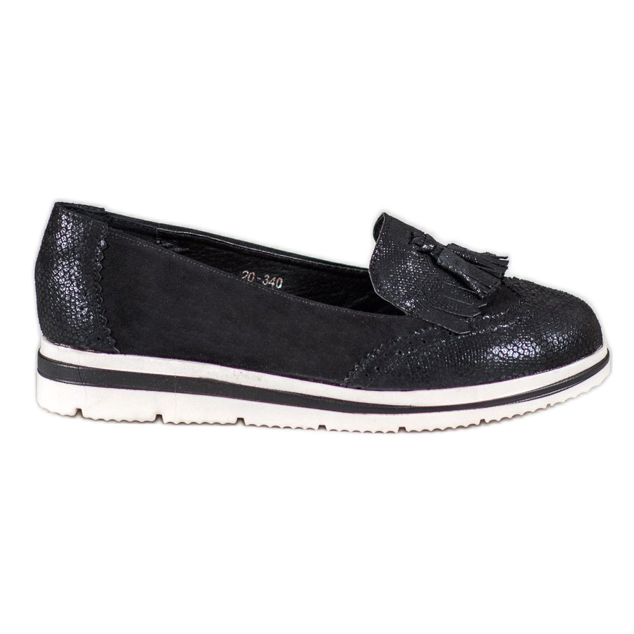 Extremt universella, svarta loafers passar perfekt in i den avslappnade stilen, perfekta för varje dag. En ytterligare fördel är en mjuk, inbyggd häl som säkerställer bekvämt bärande. En plastsula med slitbana säkerställer stabilitet och grepp på olika underlag.