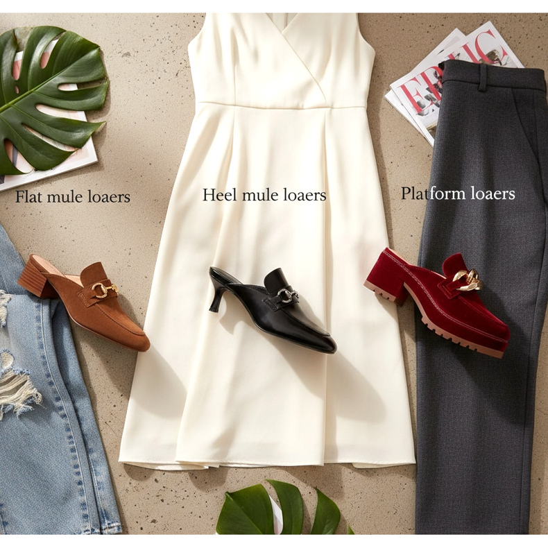 Kontorsstyling: En mule loafer med platt eller låg klack, ihop med vida byxor eller en midi-läderkjol. Toppa med en figursydd men avslappnad blus i maräng- eller pastelltoner. Effekten: professionell och modern, utan överdriven formalism.