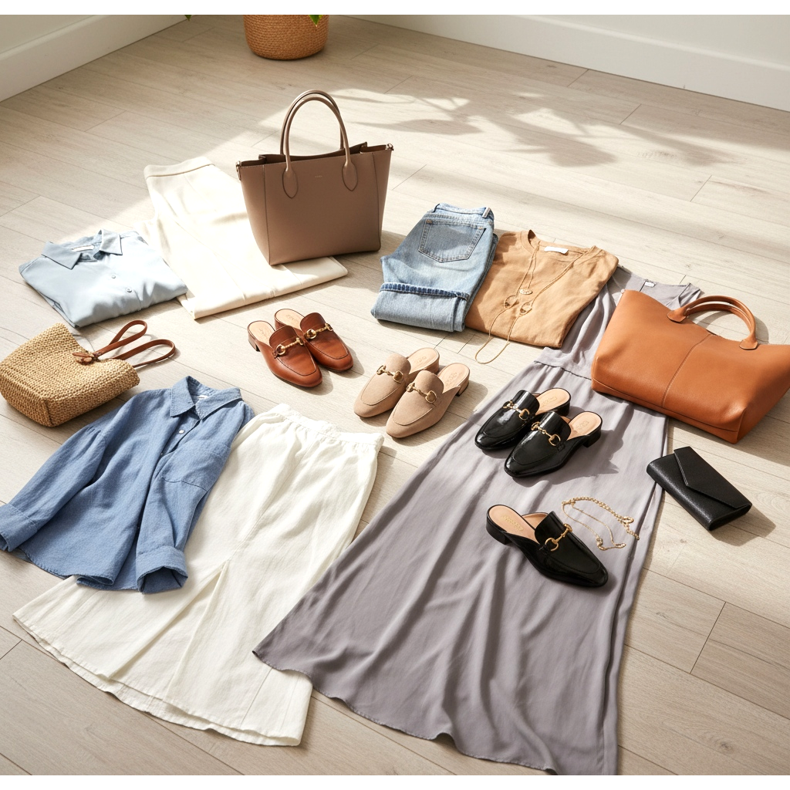 Helg och promenad: Med en maxikjol i linne och en lös skjorta – platta mule loafers i neutrala färger skapar en opretentiös, bekväm look i slow fashion-stilen, som 2026 är ett extremt uppskattat estetiskt språk.
