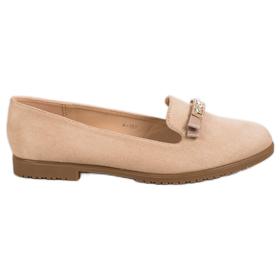 Sulan av syntetiskt material är slät vilket förbättrar greppet och komforten när du går. En intressant detalj är en dekorativ rosett med subtila kristaller som tillför elegans till skorna. På grund av avsaknaden av en klack är lords perfekta för långvarigt slitage och vardagliga aktiviteter.