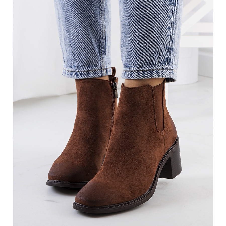 Luiza Brown High Heels - Elegans och komfort för svalare dagar. Det klassiska snittet med en rundad näsa och en stabil stolpe (6,5 cm) formar perfekt figuren, och mocka ekologiskt läder i skuggan av brun ger den sofistikerade karaktärstylingen. Stövlarna räcker till vristen (höjden ca 17 cm) och är isolerade med mjuk päls, vilket garanterar termisk komfort under hösten/vintersäsongen.