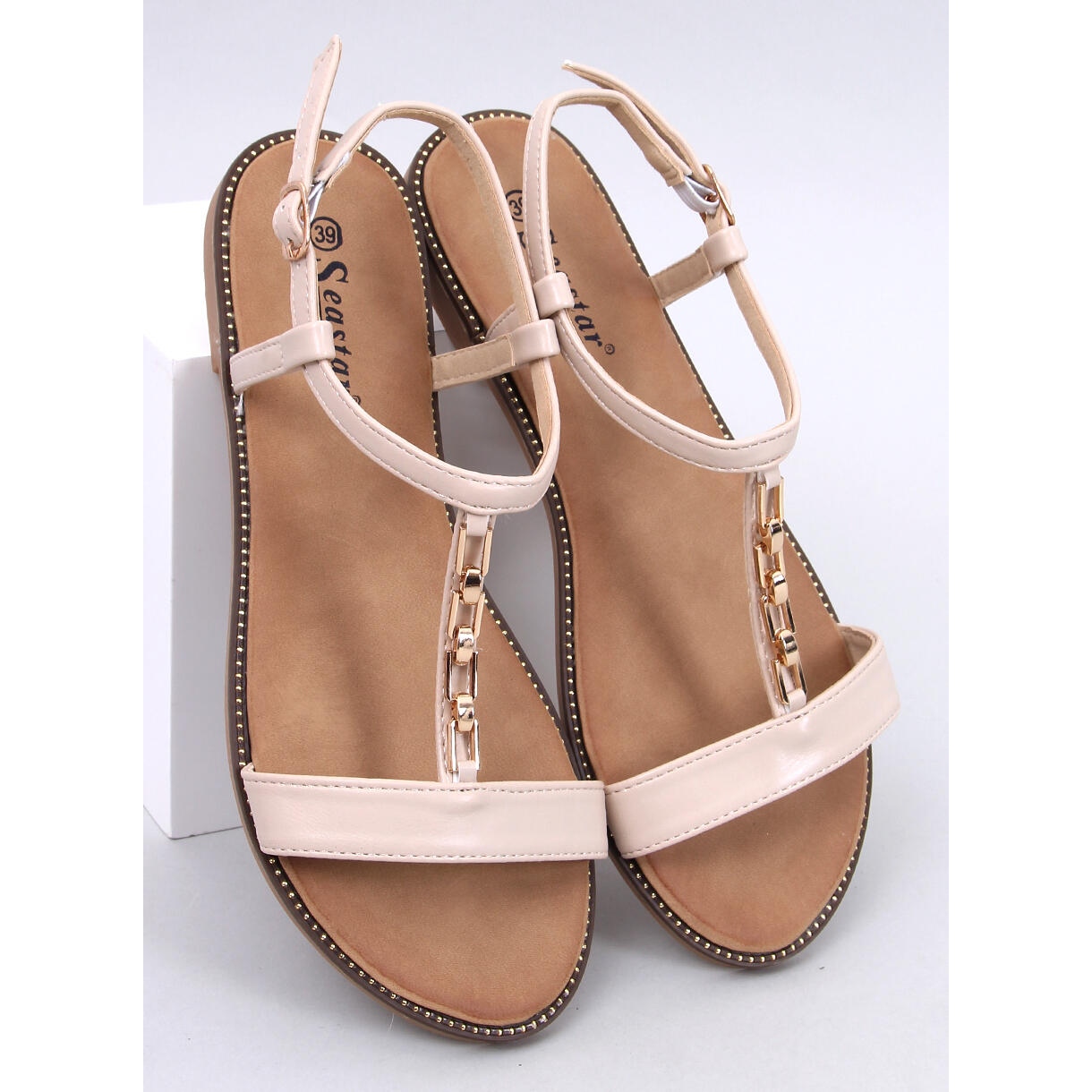 Upptäck den nya dimensionen av sommarstil tack vare kvinnors Luzi -sandaler i Beige! Dessa spannmålssandaler på en platt sula kombinerar minimalistisk design med eleganta accenter som ger charm till varje stilisering. En subtil gyllene dekoration, berikad med strass och en kedja, betonar perfekt fotens skönhet, vilket gör dessa sandaler till ett perfekt komplement till både avslappnade och mer eleganta kläder.