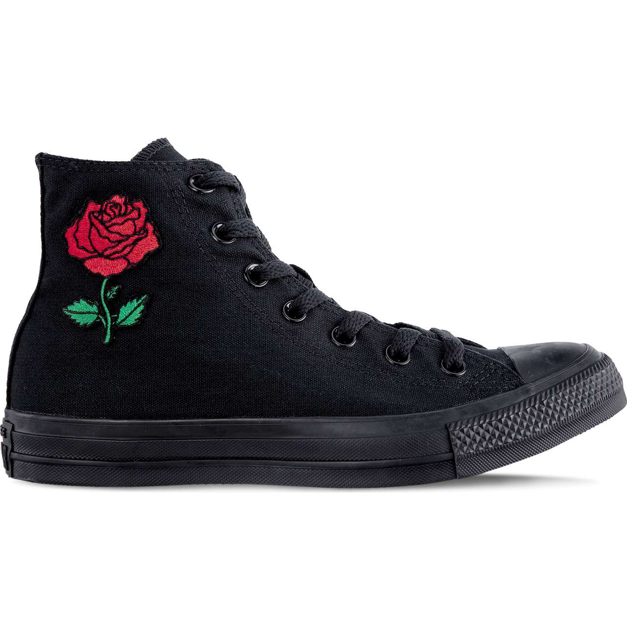 Klassiska, höga Converse sneakers i svart med en subtil applicering av röd ros på utsidan. Den andra sidan är dekorerad med en insydd Converse-logga. Tillverkad av behagligt tyg, något styvt i hälpartiet, med en karakteristisk rund tå täckt med gummi och en svart gummisula med mörkt slitbana - den perfekta kombinationen av komfort och stil.