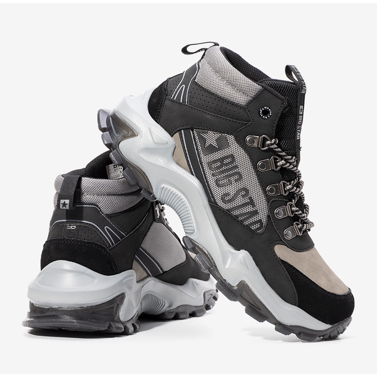 Big Star Maclovio sneakers för män i svart och grått är det perfekta valet för de kallare årstiderna. Tack vare användningen av en hög ovandel gjord av en kombination av ekologiskt läder och eko-mocka, kombinerar skorna modern design och komfort. Den fashionabla designen framhävs av höga sulor, som inte bara ger stil, utan också säkerställer komforten att bära hela dagen.