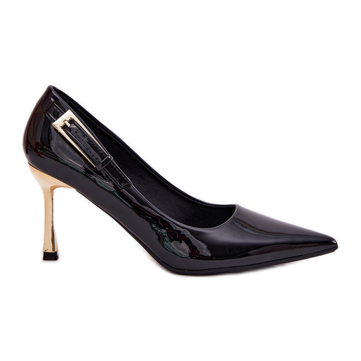 Upptäck elegans och modern stil tack vare våra lackerade klackar med en gyllene klämma i svart. Dessa unika kvinnors skor, gjorda av högkvalitativa ekosläder, kombinerar komfort och en sofistikerad design som lockar uppmärksamhet.