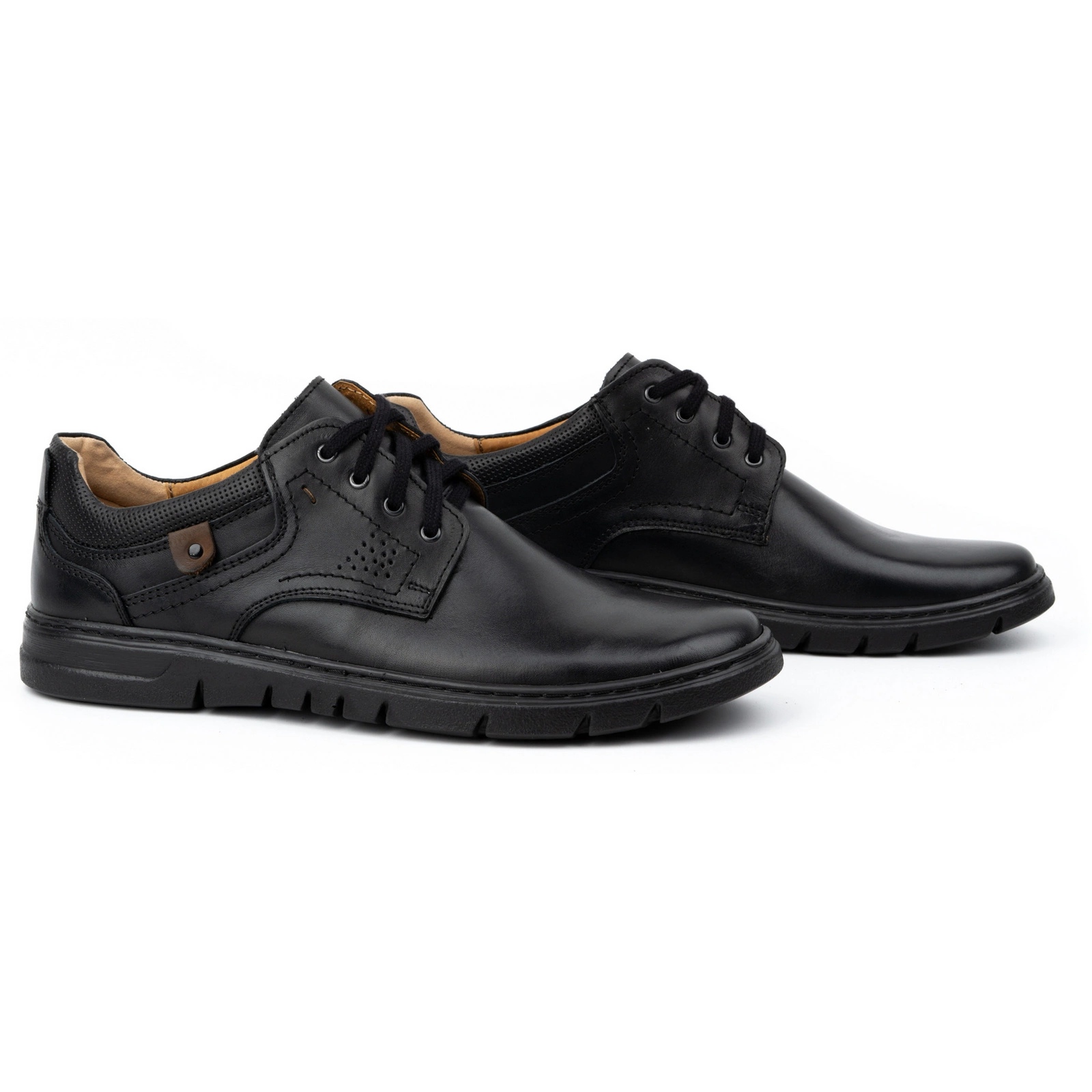 Upptäck mäns läderskor, dimma avslappnad 57kam från den polska tillverkaren Kampol - det perfekta valet för män som värderar elegans i kombination med komfort. Dessa klassiska skor i svart, med bruna tillbehör, kommer att vara bra i vardagliga stiliseringar och lägga till karaktär till varje uppsättning.