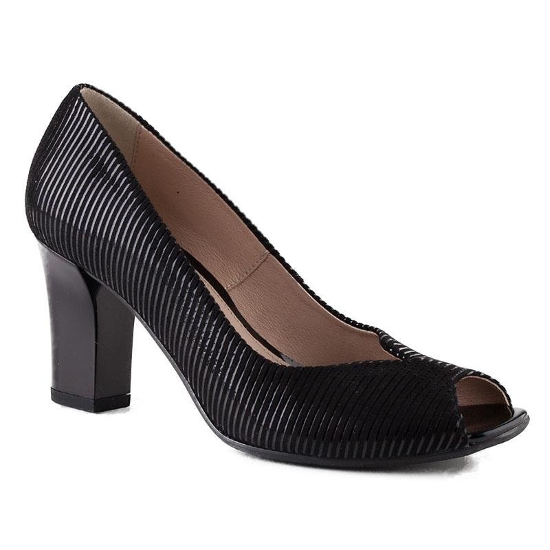 Marco Shoes pumps är ett elegant val för varje modern kvinna som vill lägga till en touch av sofistikering till sin stil. Dessa skor är gjorda av högkvalitativt svart naturligt mockaskinn och kombinerar perfekt klassisk med modern design. Uttrycksfulla dekorativa ränder på ovansidan lockar uppmärksamhet och ger dem en original karaktär.