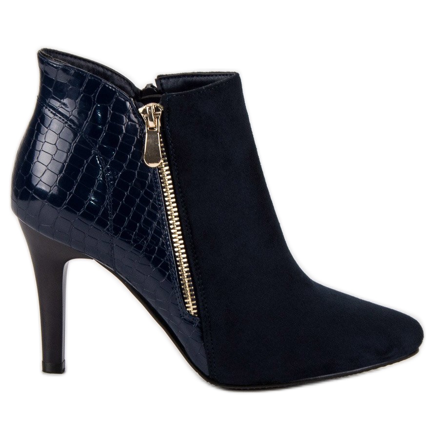 Marinblå högklackade ankelboots är ett perfekt val för kvinnor som vill kombinera elegans med lite häftighet. Dessa unika mörka marinblå skor glädjer med sin originalitet och stil. De är gjorda av högkvalitativa material som kombinerar ekologisk mocka med lack, vilket ger dem en unik karaktär.