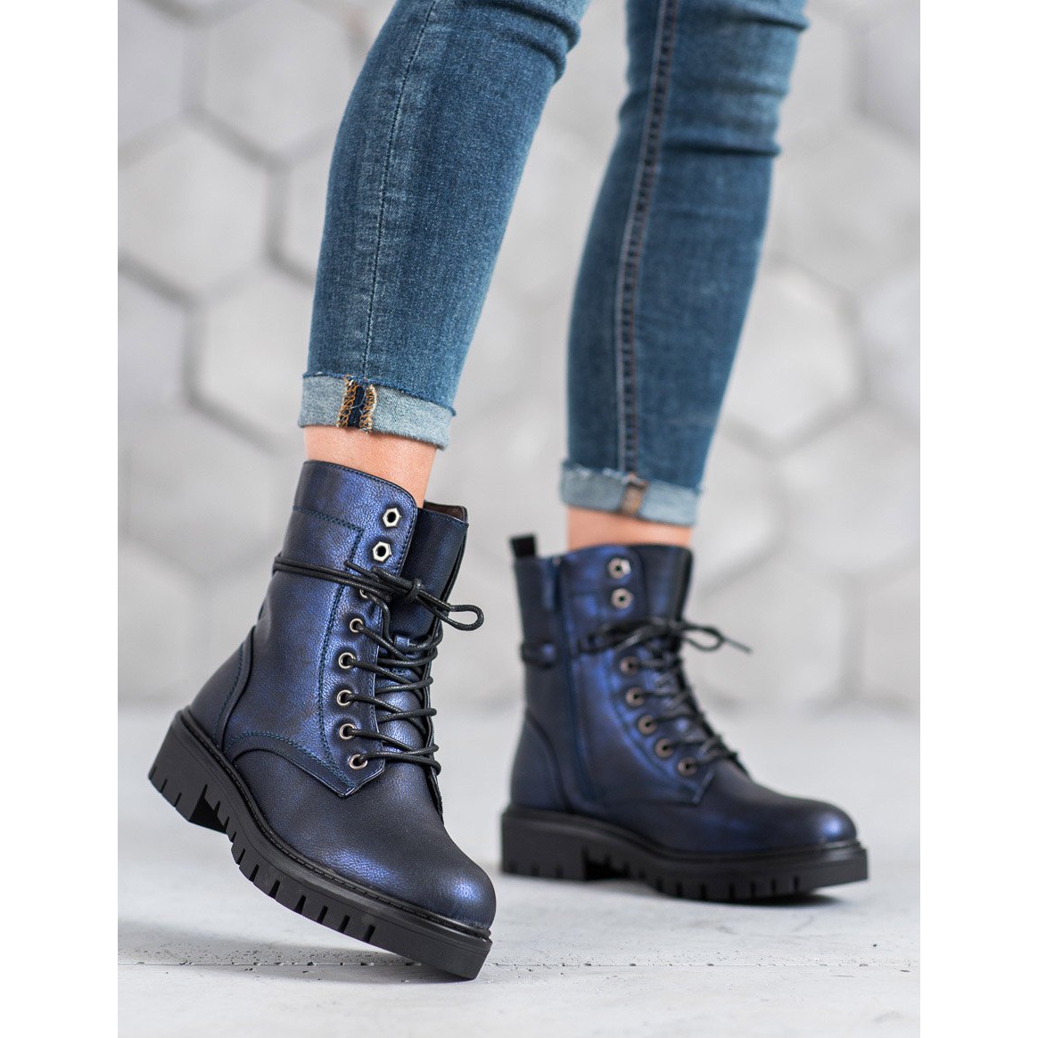 Vi presenterar marinblå bovver-stövlar från det välkända märket M.Daszyński - det perfekta valet för kvinnor som värdesätter stil och komfort. Tillverkade av ekologiskt läder av hög kvalitet, lockar dessa unika skor uppmärksamhet med en glänsande ovandel i en intensiv blå färg, som ger dem karaktär.