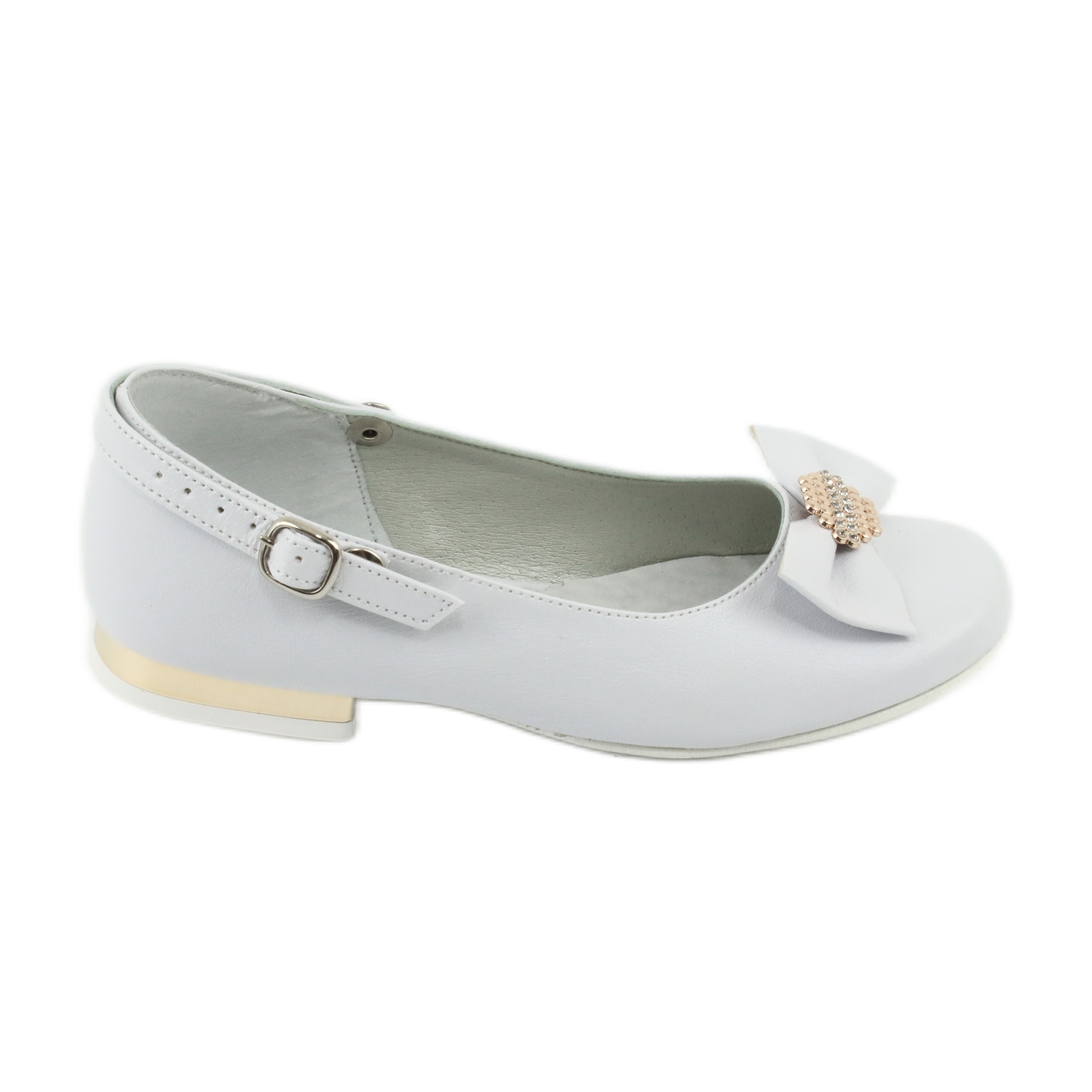 Utmärkt av sin vita färg och en charmig rosett dekorerad med glänsande strass, matchar Miko pumps perfekt det eleganta utseendet hos ett barn vid en viktig ceremoni. Förfinade i varje detalj ger de både estetiska intryck och funktionalitet. Dessa balettlägenheter finns i vitt, gult och guld, vilket gör att du enkelt kan matcha din stil.