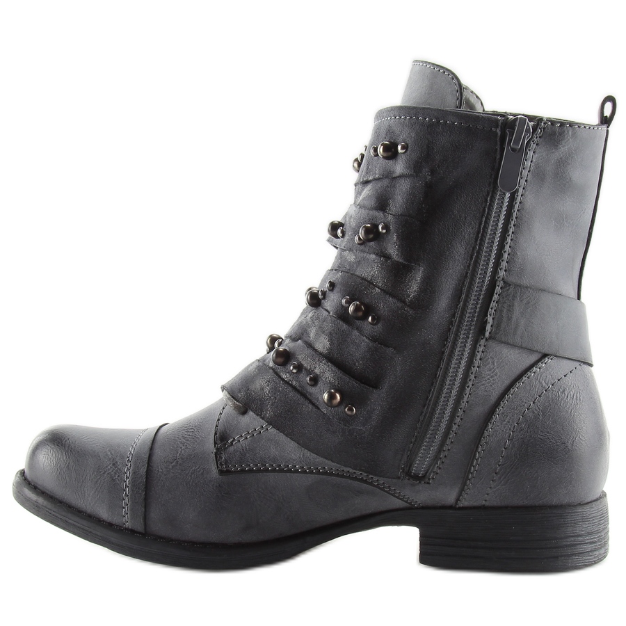 Vi presenterar militärstövlar för kvinnor i grå färg, som kombinerar stil, komfort och originalitet. Tillverkade av högkvalitativt ekologiskt läder erbjuder de inte bara ett attraktivt utseende, utan också hållbarhet. Deras karaktäristiska ovandel med en iögonfallande flik dekorerad med strass väcker uppmärksamhet, vilket ger en unik karaktär till varje styling.